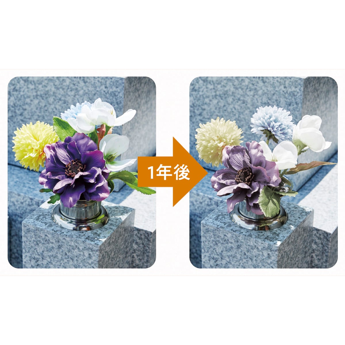 フェイクフラワーの場合 色鮮やかなフェイクフラワーも屋外では半年ほどで色褪せてしまいます。