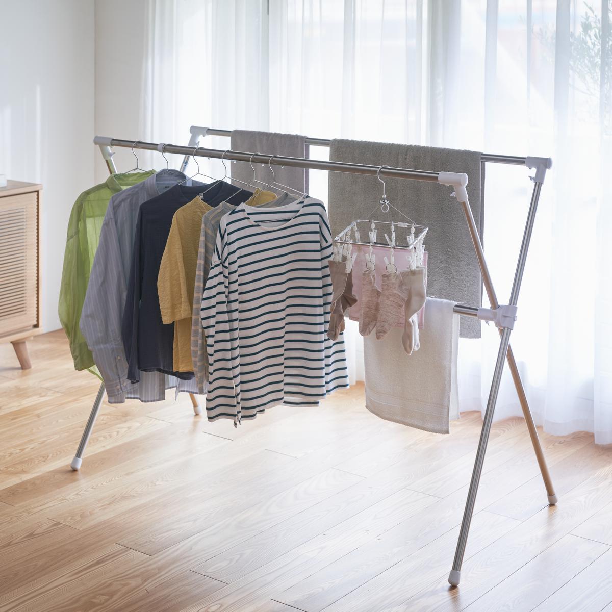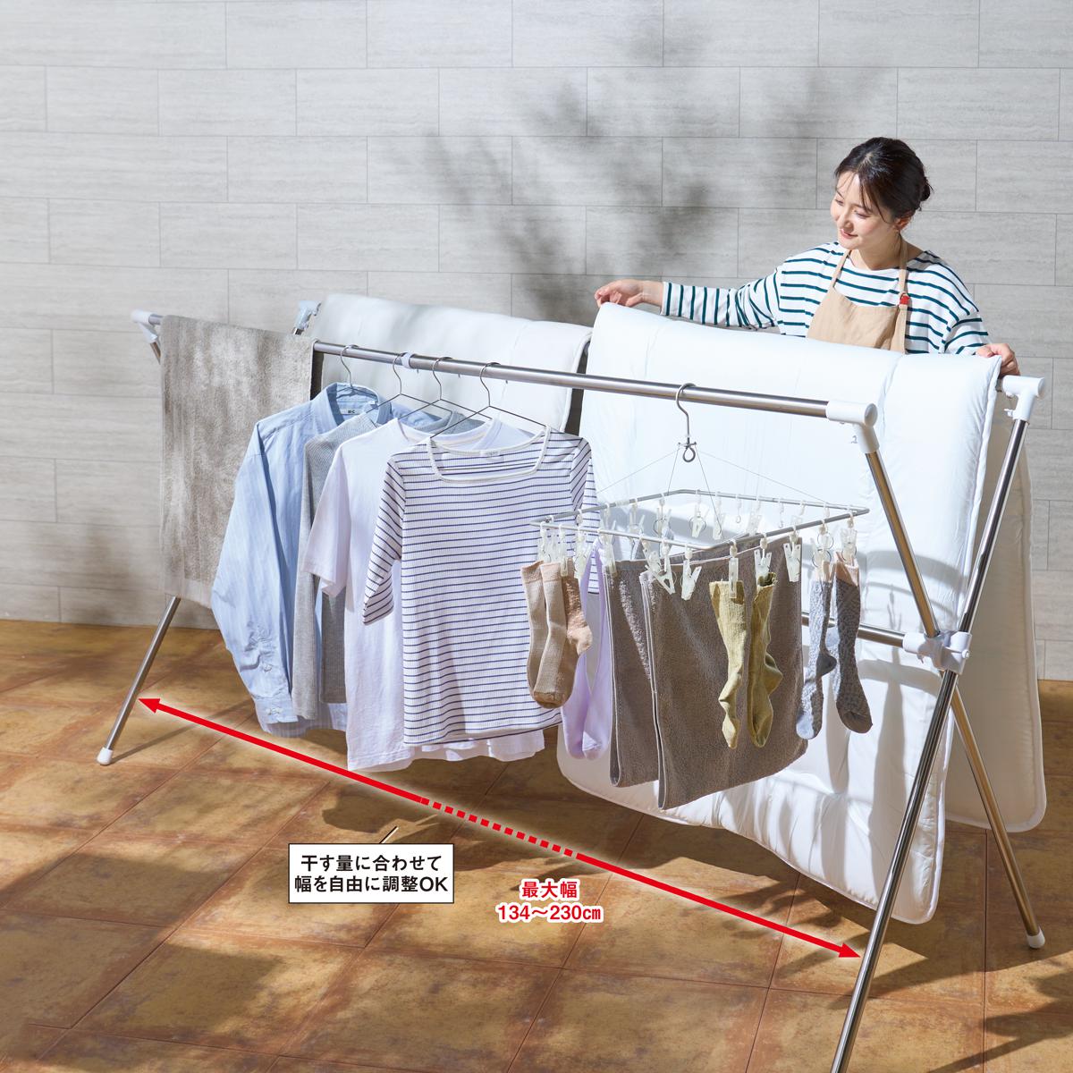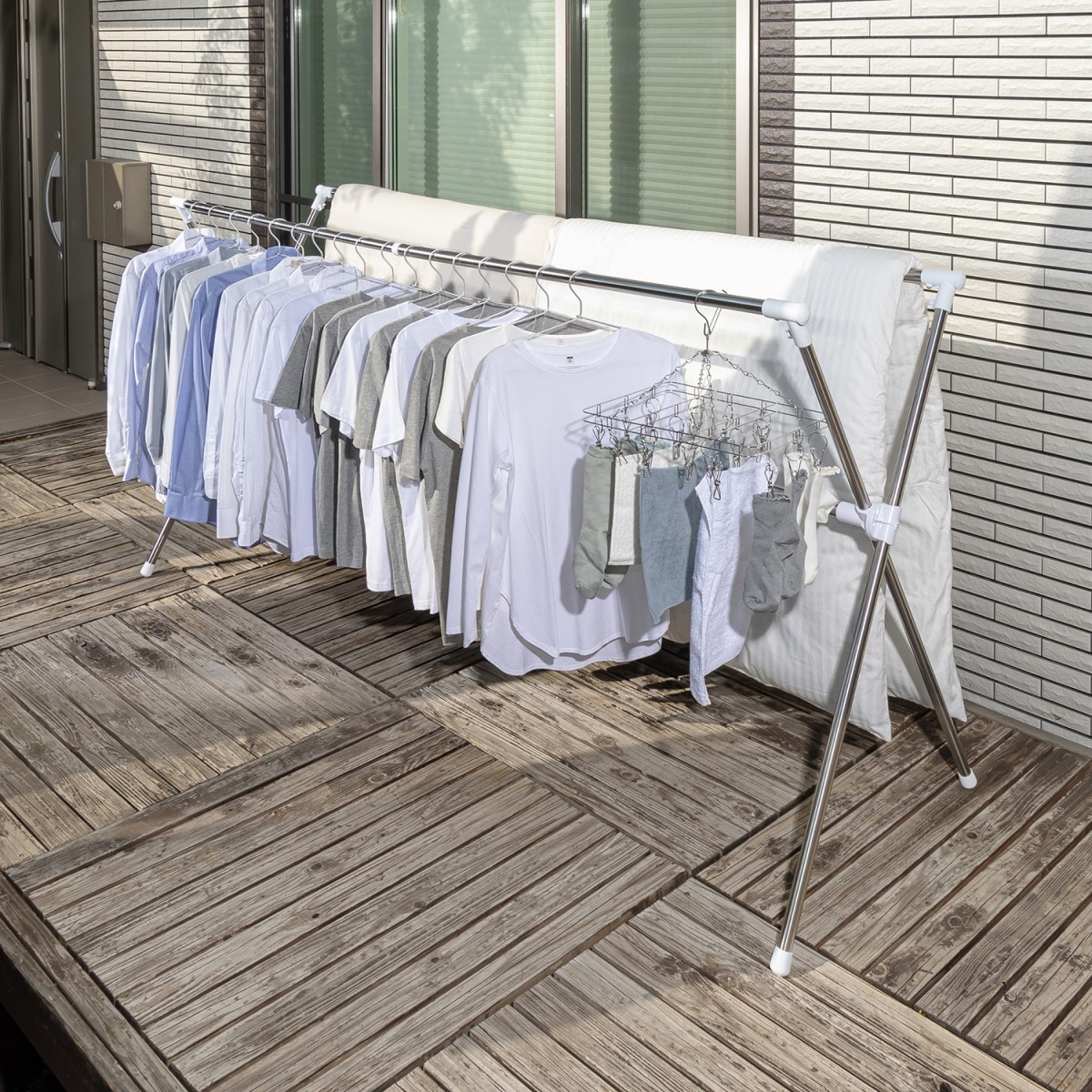 干す量に合わせて幅を自由に調整できるX型物干しです。シングルの布団を最大4枚干すことができます。ステンレス製でさびにくく、屋内・屋外兼用使用可能。軽量で持ち運びやすいのも嬉しいポイント。畳んだときの厚みは約8cmなので、使わないときはスリムに収納できます。