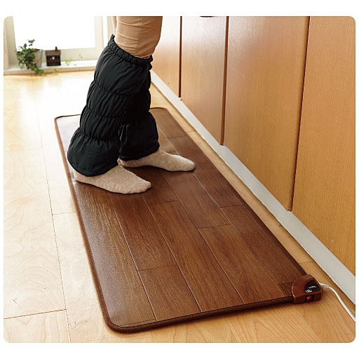 調理中は意外と足元が冷えるからあったかマットで心地よくクッキング。フローリングになじむ木目調で、スペースに応じて選べる4サイズ。