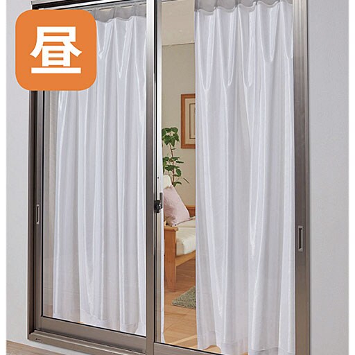 【レースカーテンの透け感の目安(室内からの様子)】UVカット率・遮熱保温効果・目隠し効果の高いレースカーテンは、一般的なレースカーテンに比べて室内から外が見えにくくなります。また、昼間はお部屋の中が若干暗く感じる場合があります。※商品の素材感や色味・使用環境により異なりますのであくまで目安としてください。