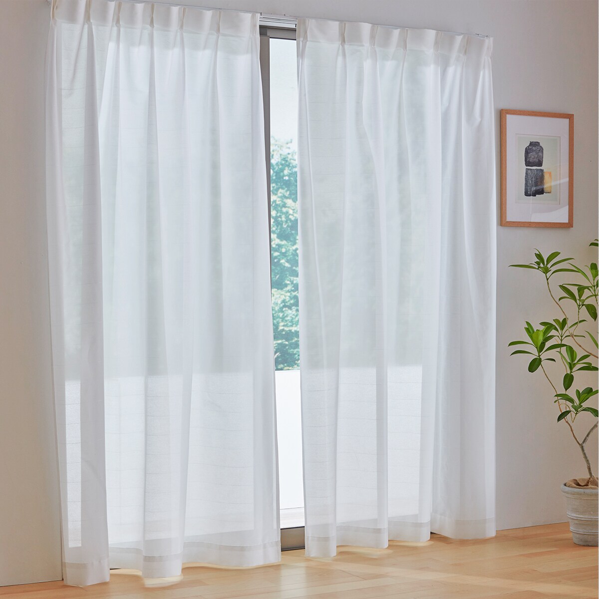 ペットの引っかきでお困りの窓に! 表面がツルッとした生地のボイルカーテンです。シンプルなボーダー柄でお部屋にも合わせやすい。UVカット機能も備えました。