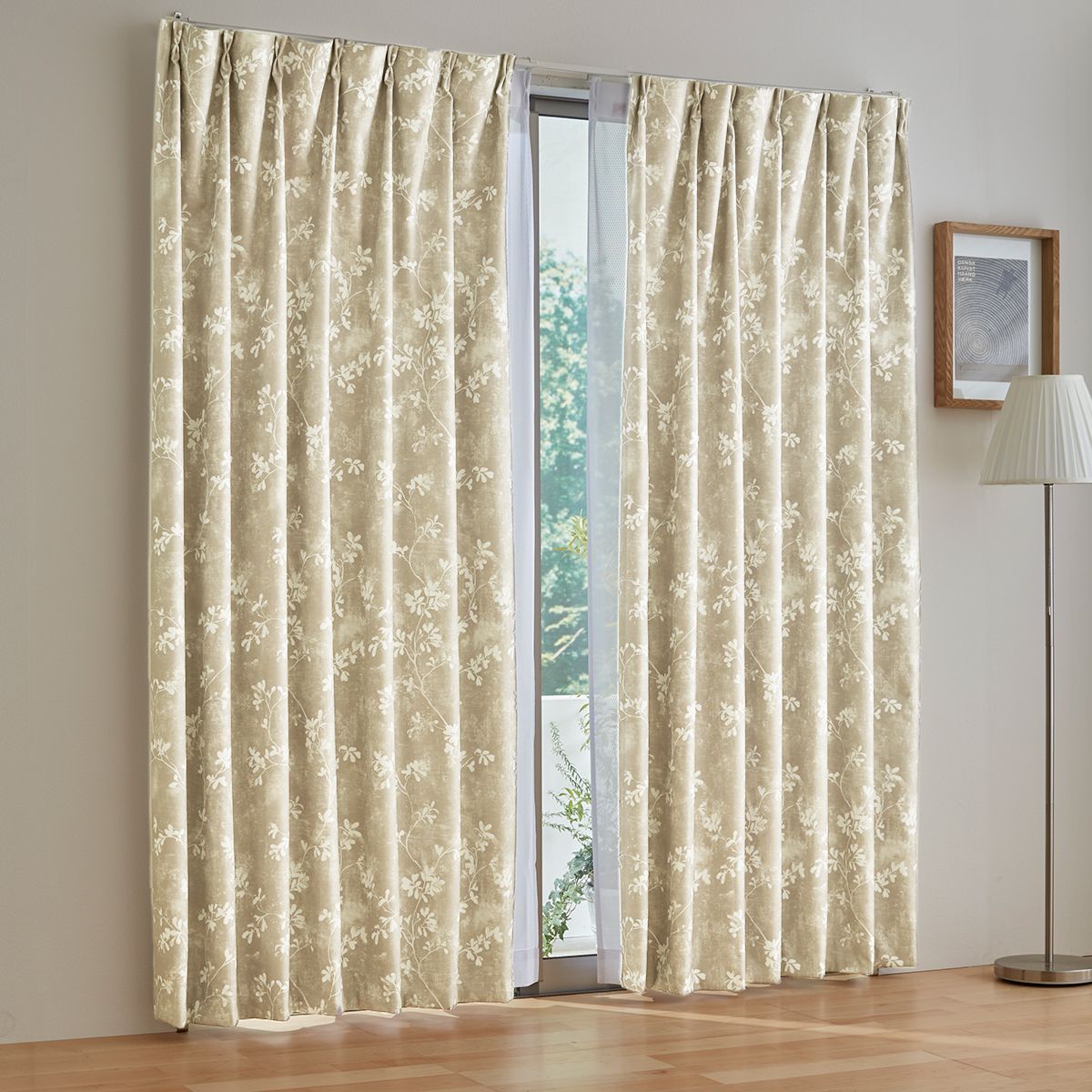 〔形状記憶加工付き〕外からの音や光をしっかりガードし、朝までぐっすり。シャビーリーフ柄が美しい、遮音1級遮光カーテンです。窓外から入る音はもちろん室内の音漏れも軽減します。