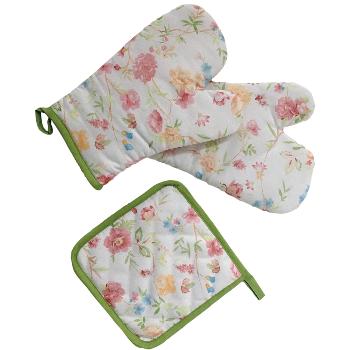 エプロン・ミトン2枚・ポットホルダーの4点がセットになった、お買い得なポルトガル製のキッチンセットです。綿100%なのでやさしい肌ざわり。エプロンはローズ柄のモチーフがエレガントな雰囲気を演出。ミトンとポットホルダーはグリーンのパイピングがおしゃれなポイントです。プレゼントにもおすすめ。ご家庭の洗濯機で気軽に洗えます。