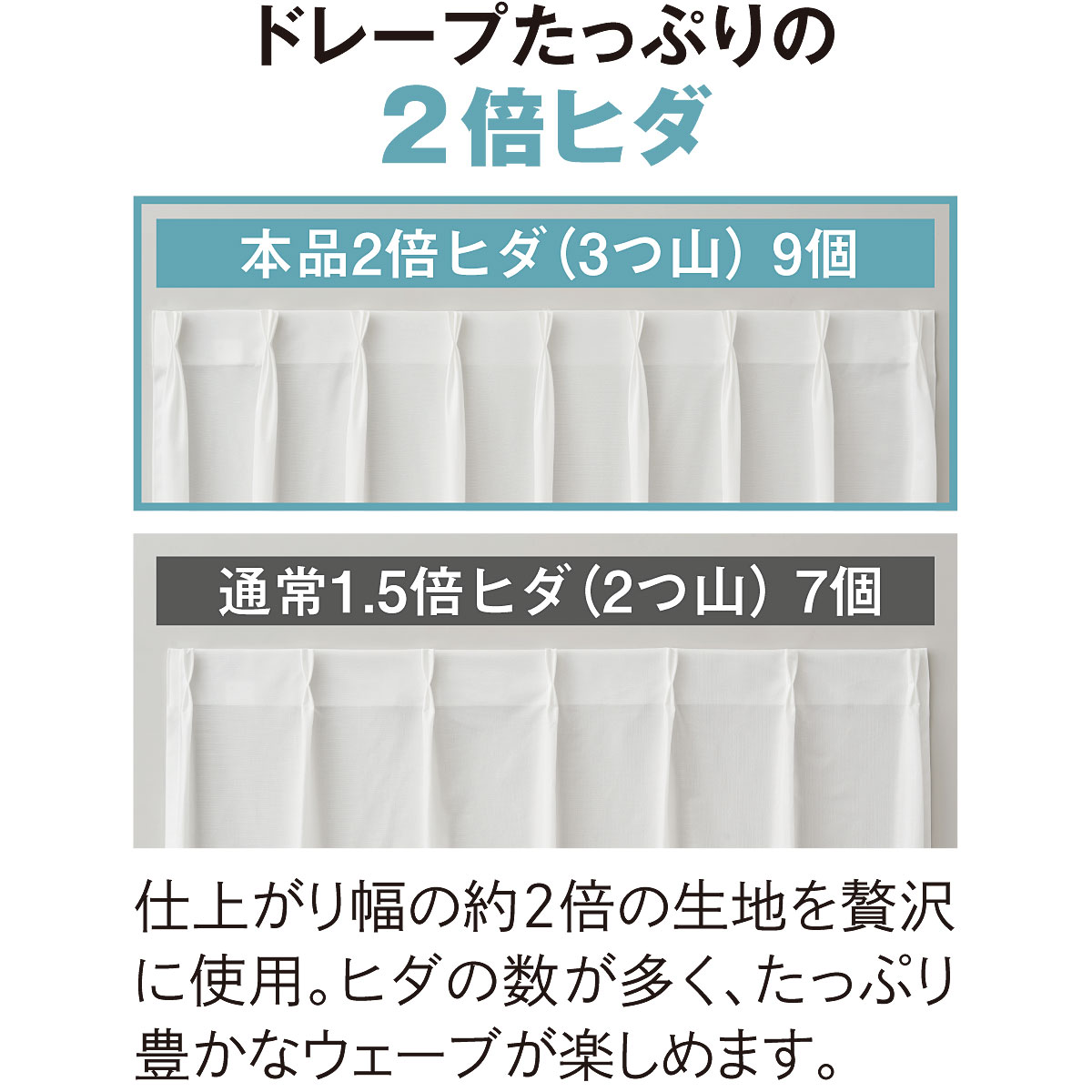 通常のカーテンは仕上がり幅1.5倍の生地を使用するところ、この商品は約2倍の生地を使用。たっぷり豊かなウェーブが出るので優雅な印象に。