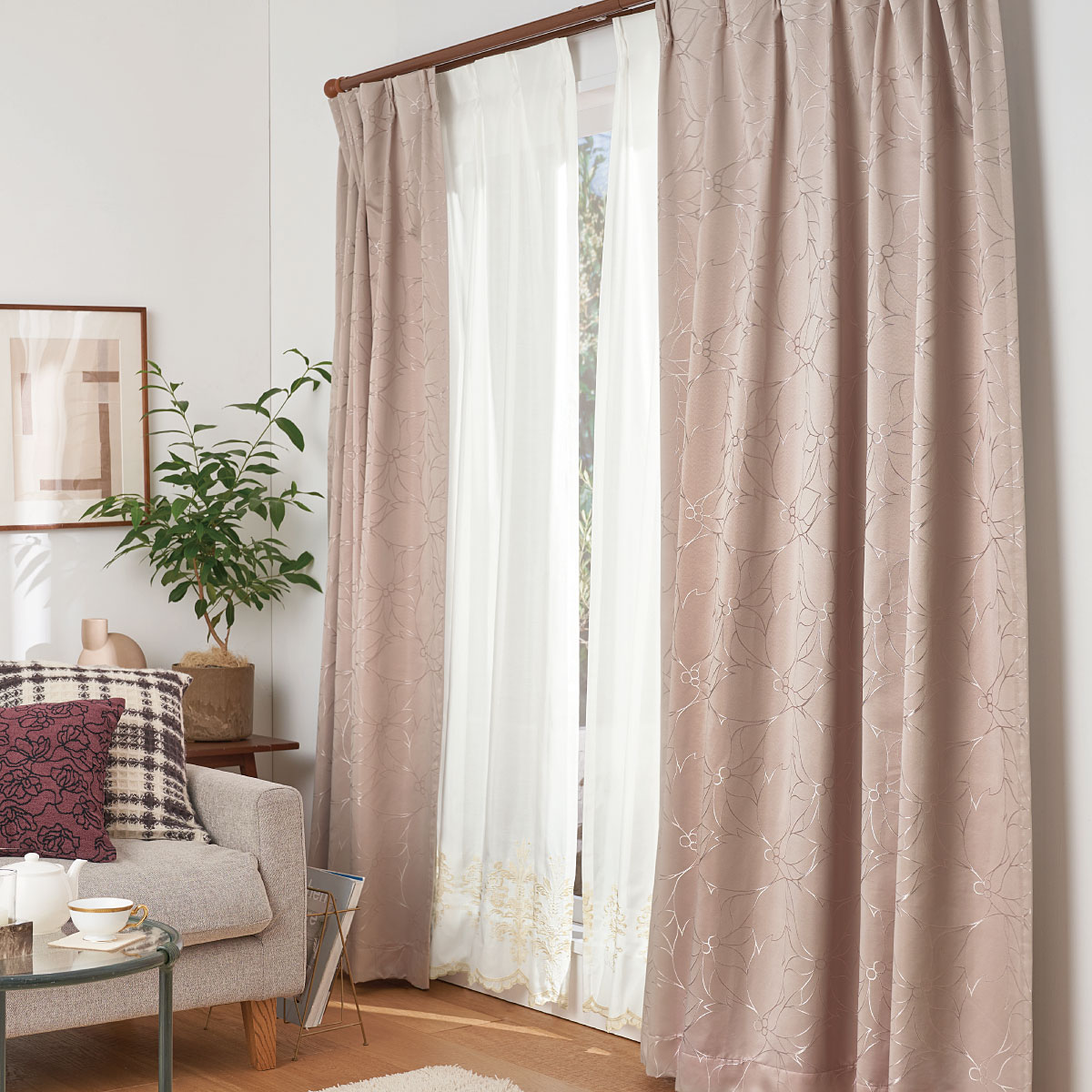 美しい光沢とジャカード織りで表現された立体感のある花模様が魅力のカーテンです。1級遮光裏地付きで、気になる光もしっかりカット。夜の光漏れも防ぎ、プライバシーも守ります。冷暖房効率を高め、省エネしながら1年中快適に過ごしたい方にぴったり。