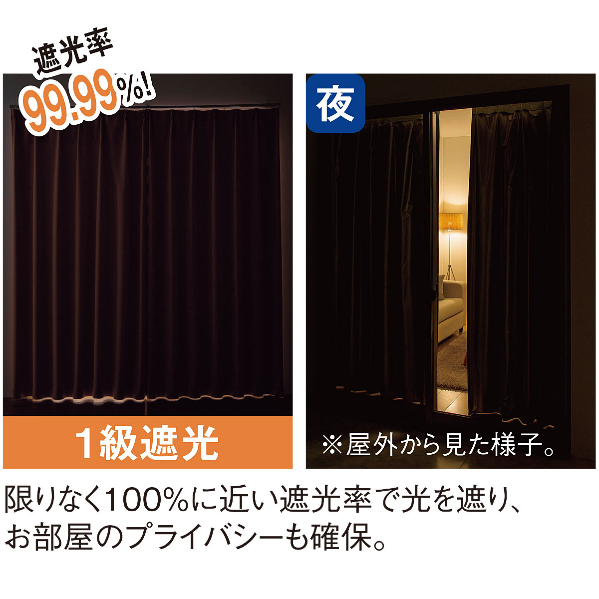 遮光率99.99%でまぶしい西日の日差しも、夜の光漏れもカットする1級遮光。※左:室内から見た様子 右:夜に屋外から見た様子