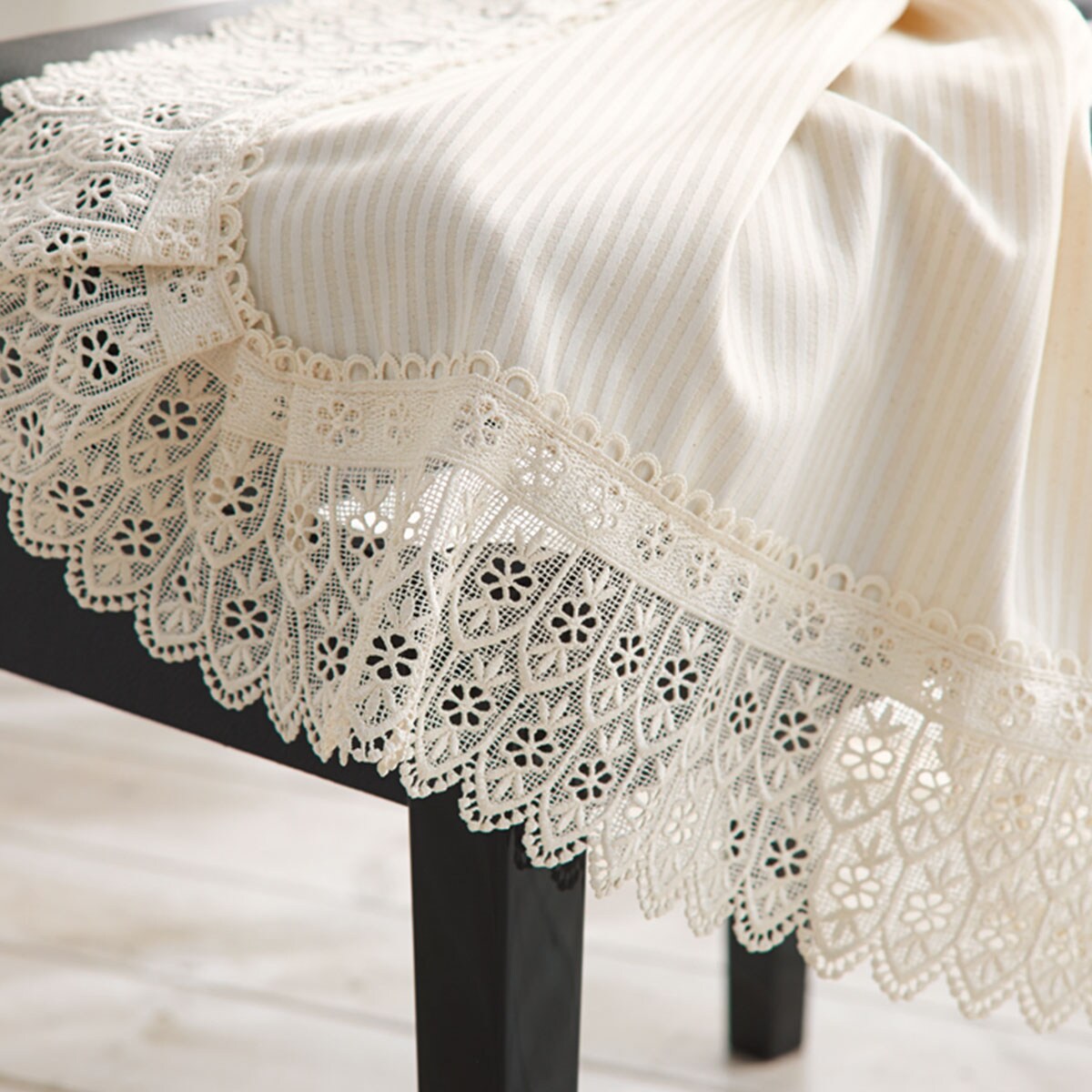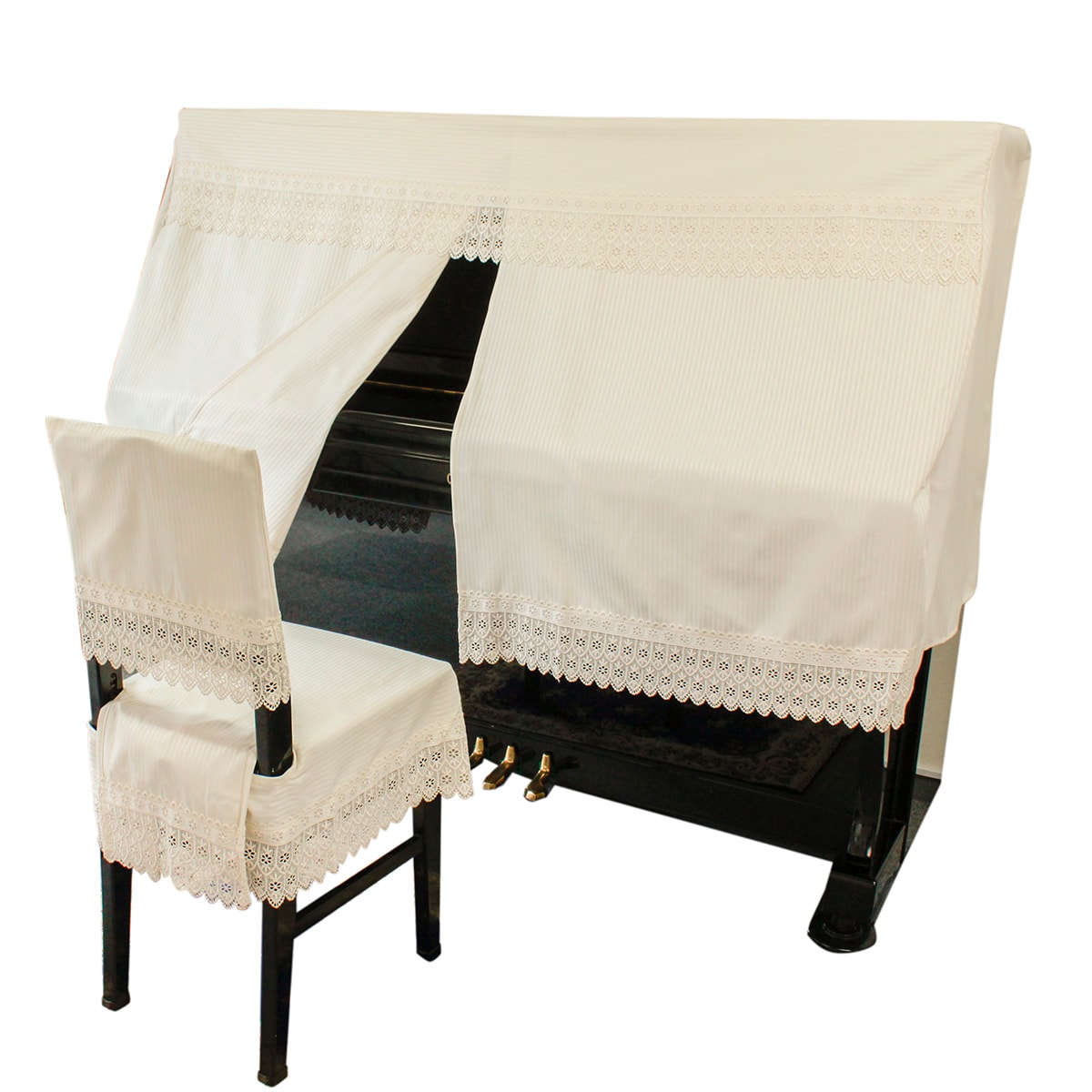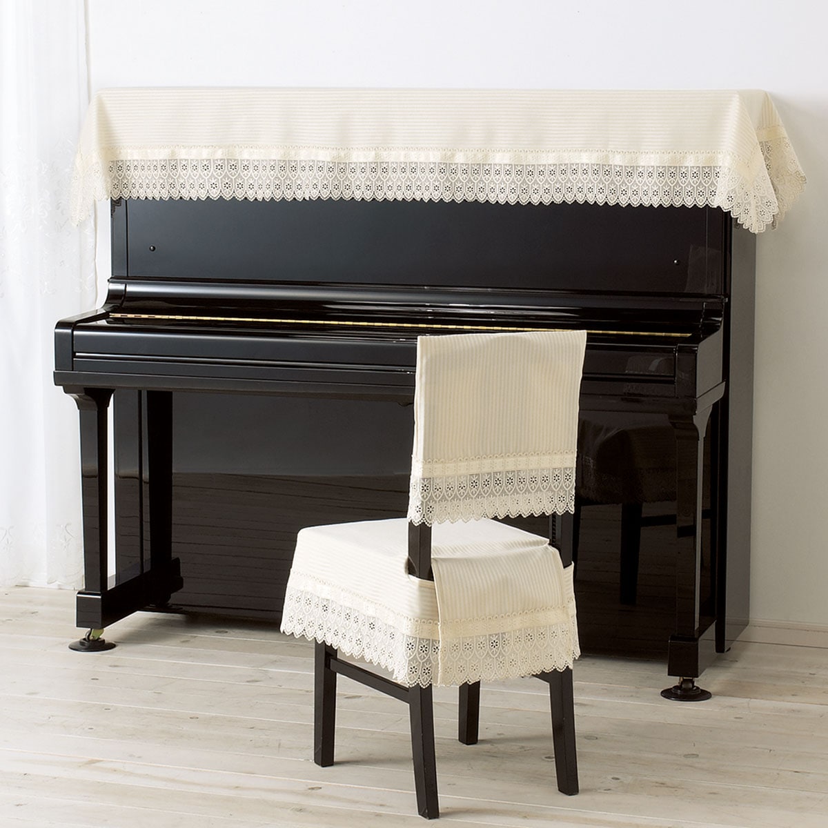 レース使いが美しい、清楚なデザインのスペイン製ピアノカバーです。アップライトピアノを汚れやホコリから守ります。お揃いのチェアカバーもご用意しました。