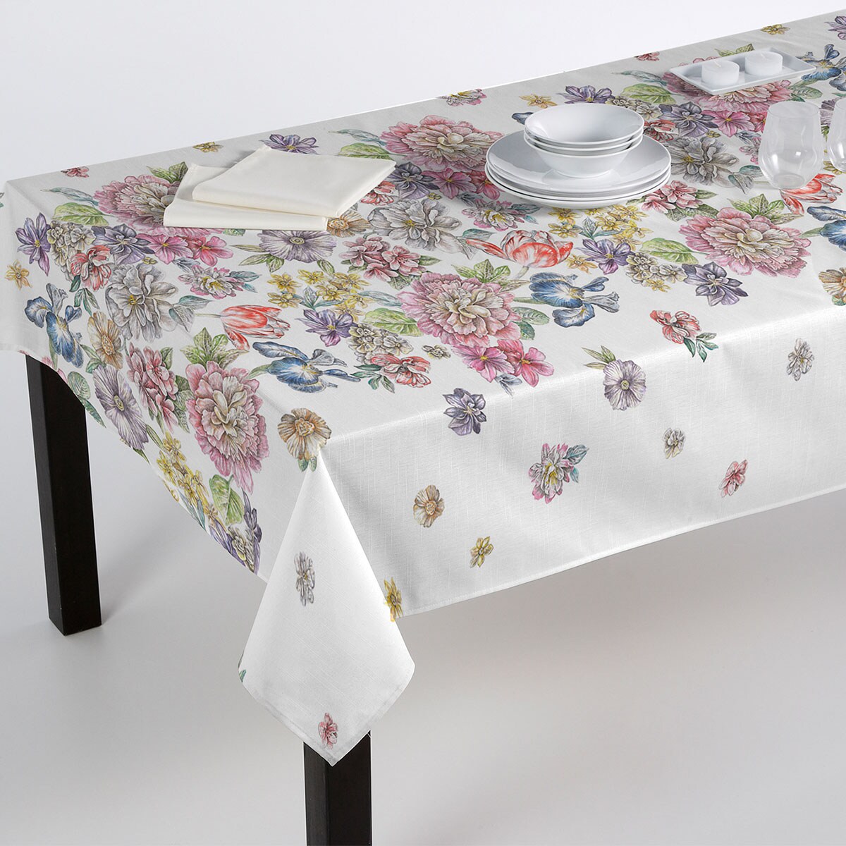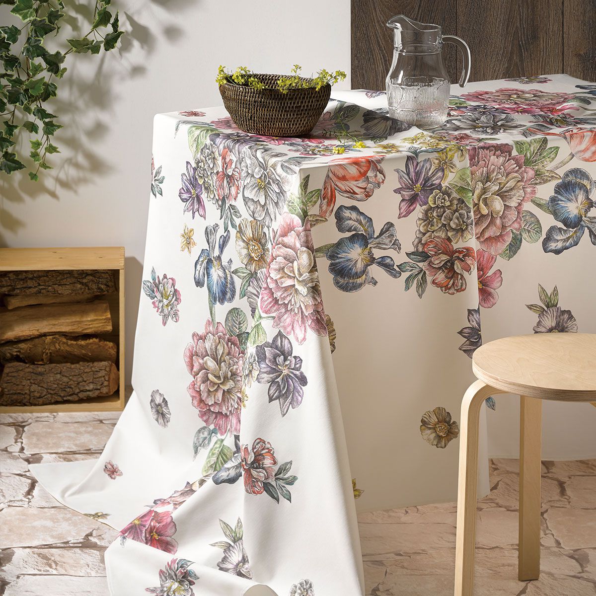 繊細なタッチで描かれた可憐な花々が美しい、スペイン製のテーブルクロスです。テーブルにサッと掛けるだけで、ダイニングが明るい雰囲気に。毎日の食卓を華やかに彩ります。正方形から円形まで、豊富なサイズ展開をご用意しました。汚れたら洗濯機で丸洗いできるので、清潔にお使いいただけます。
