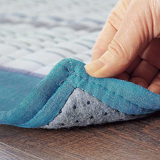 さらりとした感触でベタつきにくいから素足で歩いてもいつも快適。凹凸のあるシボが特徴の綿100%しじら織りラグです。やわらかい中わたと固わた(中材)を使用した多層構造で、ふっくらした肌ざわりなのに踏み心地はしっかり。ホットカーペット・床暖房にも対応しているので、季節を問わずオールシーズンご使用いただけます。裏面はすべりにくい加工でズレにくく、掃除機掛けもスムーズ。汚れても洗濯機で丸洗いできるので、清潔にお使いいただけます。