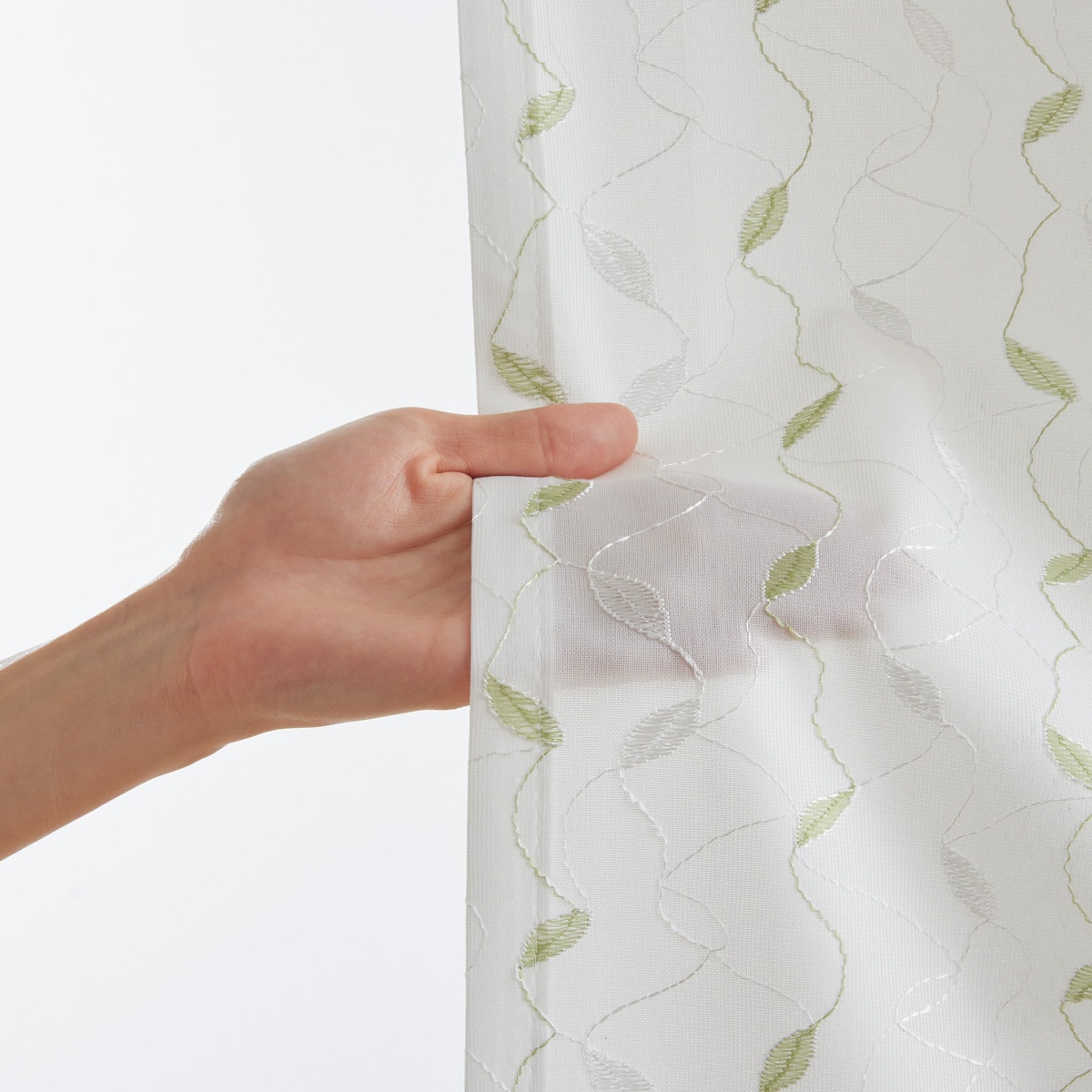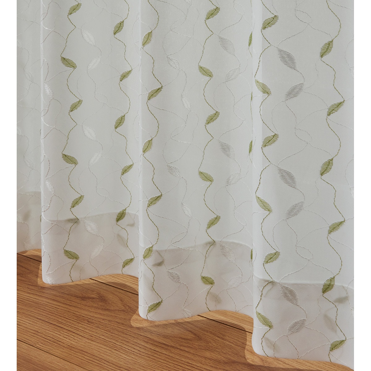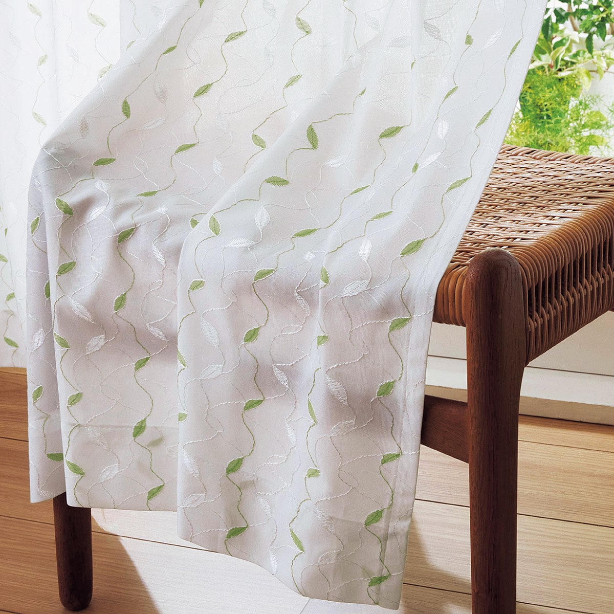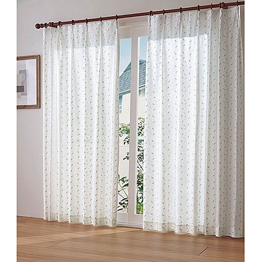 グリーン系光に透けて輝く刺繍風のリーフ柄が美しいレースカーテンです。