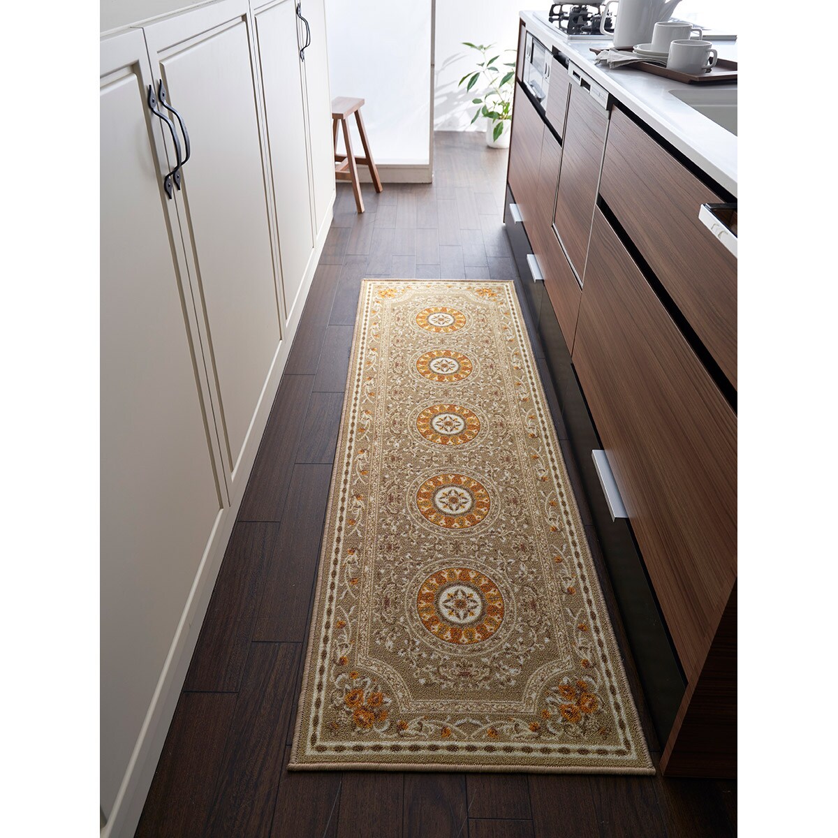 床をしっかりガードしたいというお客様の声にお応えして、大きめの60cm幅と79cm幅をご用意しました。床を広くカバーし、キッチンに敷き詰めてお使いいただけます。はっ水加工を施しているので、水汚れはサッと拭くだけで簡単にキレイに。丈夫な素材でみっちり目を詰めて仕上げているので、耐久性もあり長くお使いいただけます。エレガントな柄も魅力で、より印象的なキッチンを演出。裏面はすべりにくい加工でズレにくく、掃除機掛けもスムーズです。