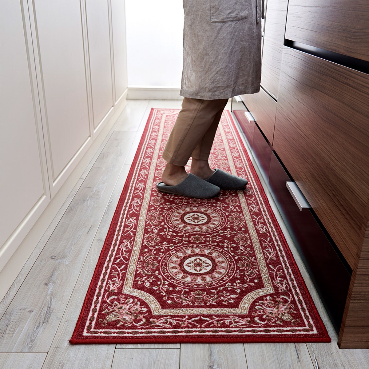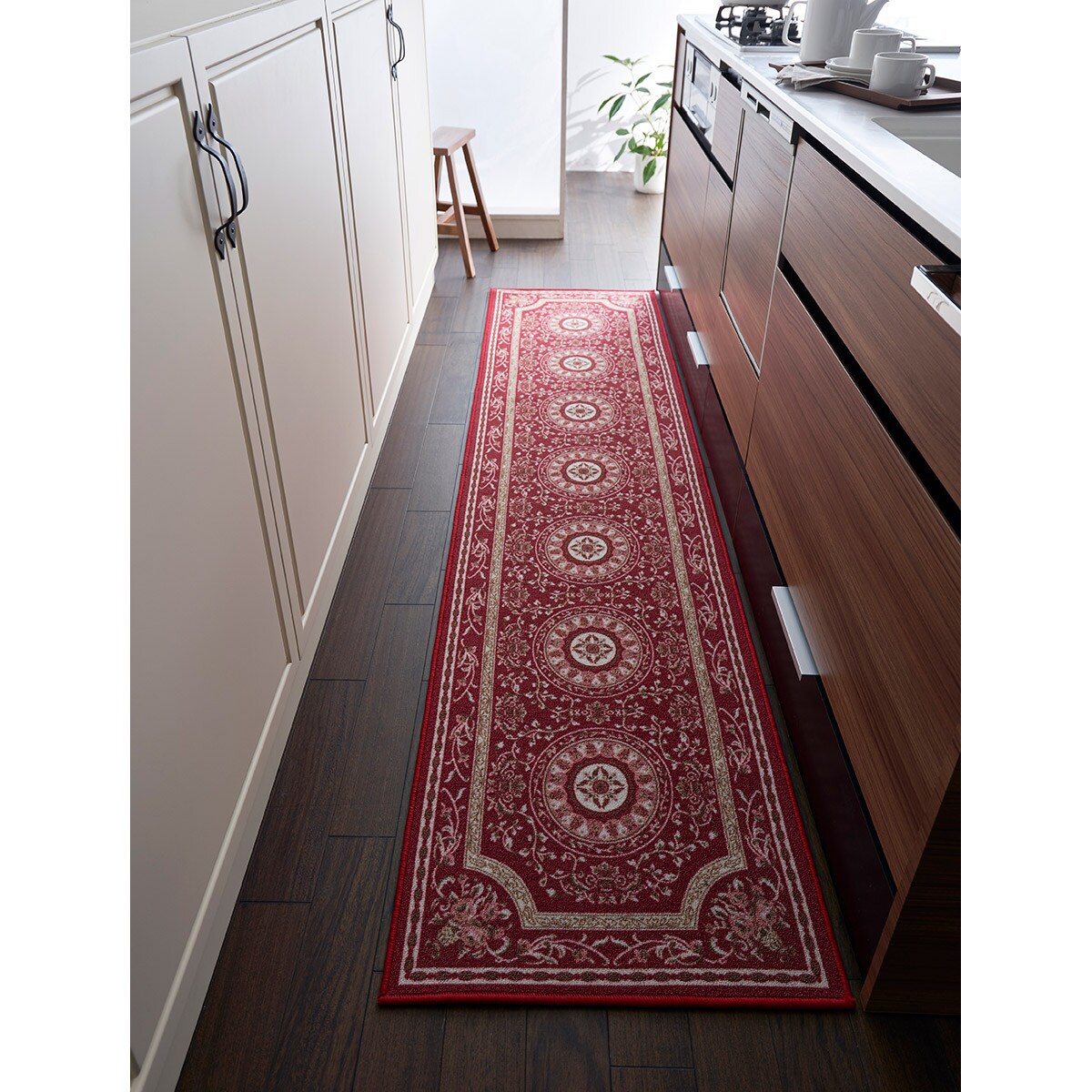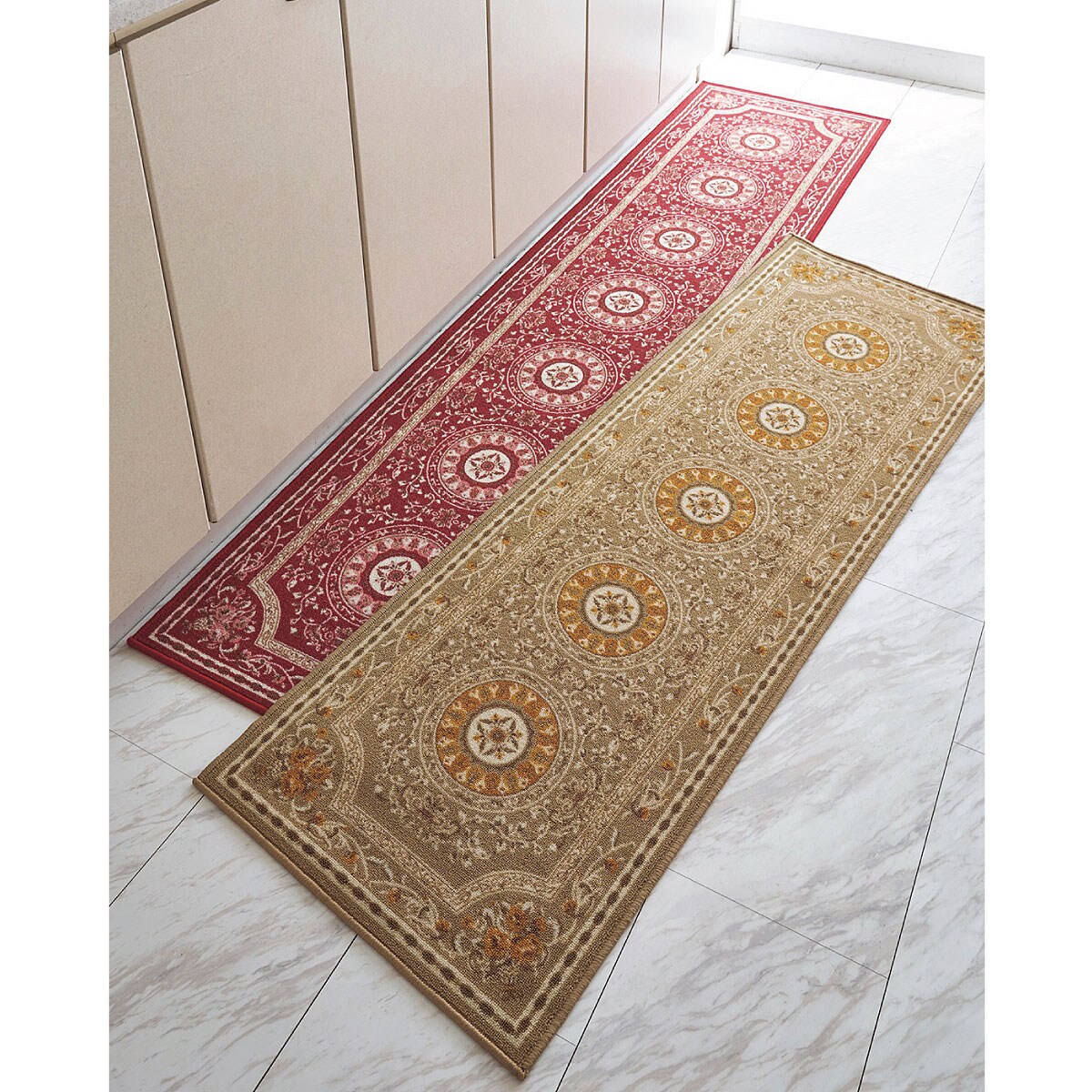(左から) ワイン(横240×縦60cm)・ベージュ(横180×縦60cm)エレガントな柄で、印象的なキッチンに。