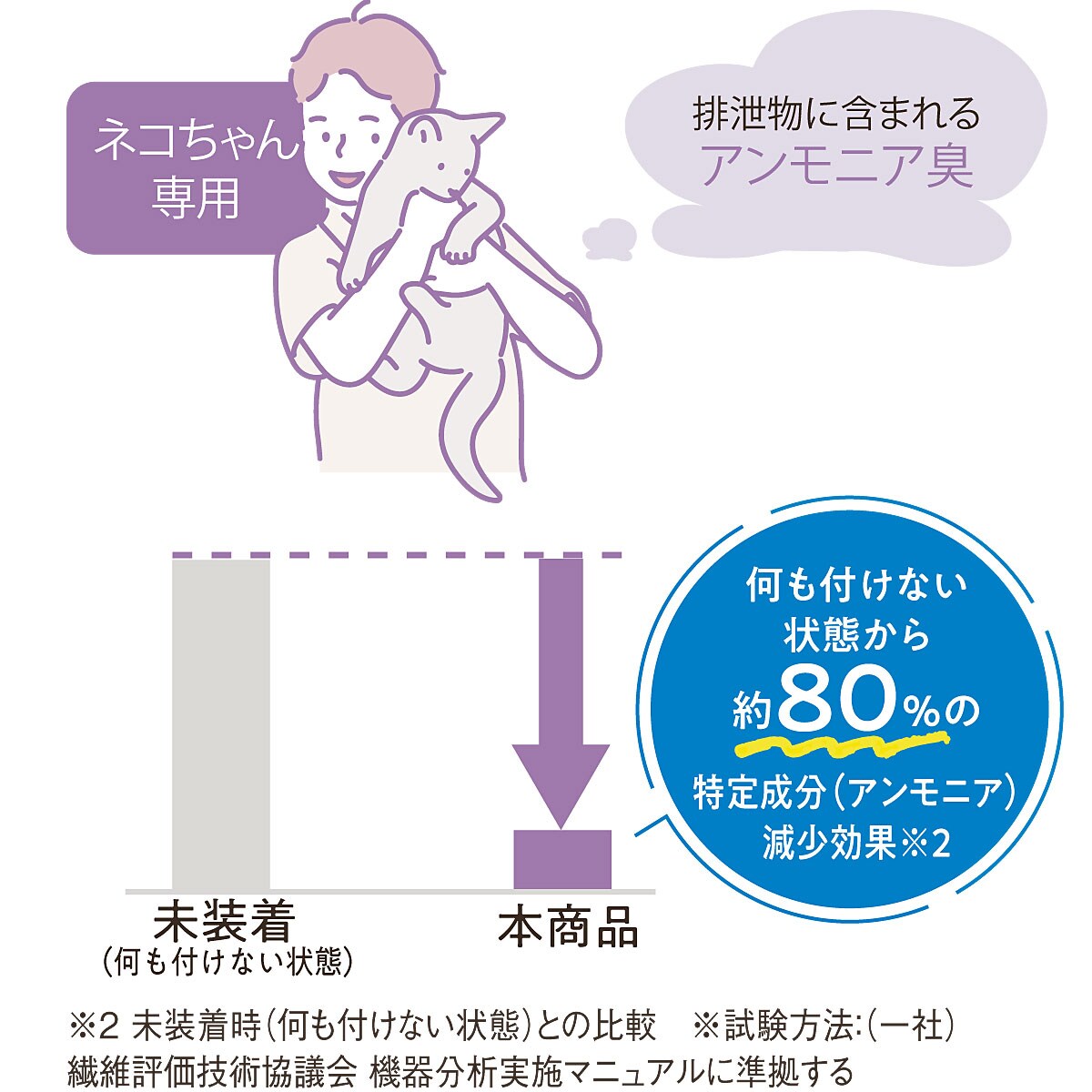 猫特有のニオイとして、排泄物に含まれるアンモニア臭に着目。特定成分を約80%減少させる効果を発揮し、お洗濯後も効果が持続します。