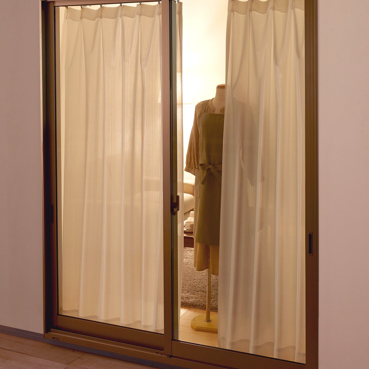 部屋の外から見た様子(夜) ※使用環境の部屋の明るさにより印象は少し変わります。一日中目隠し効果が発揮され、外からほとんど見えません。