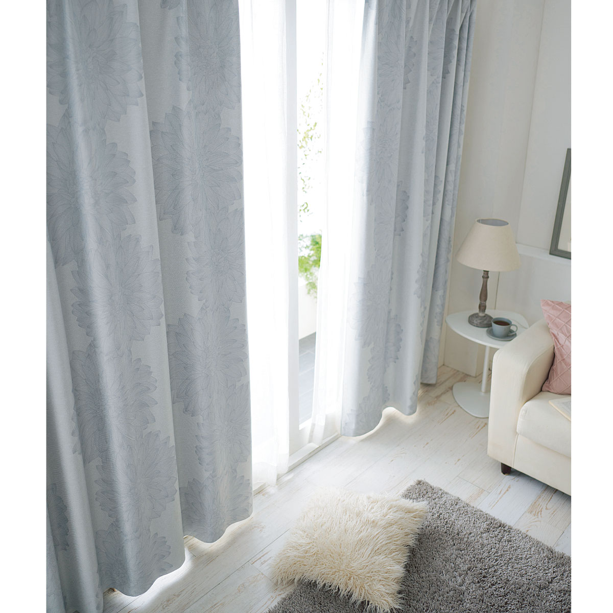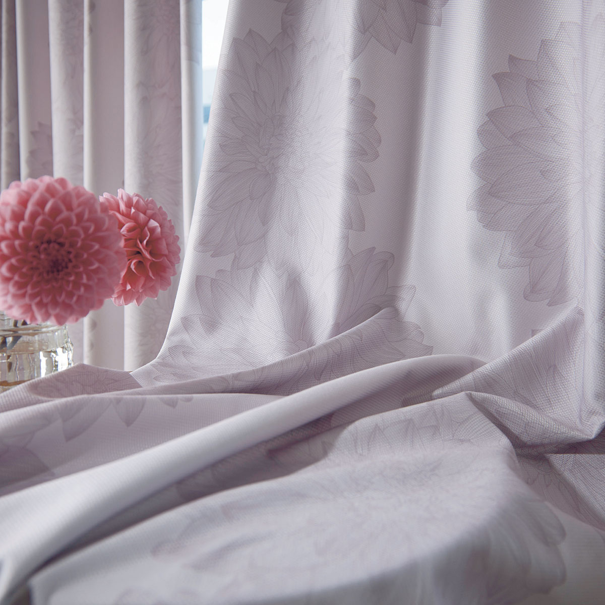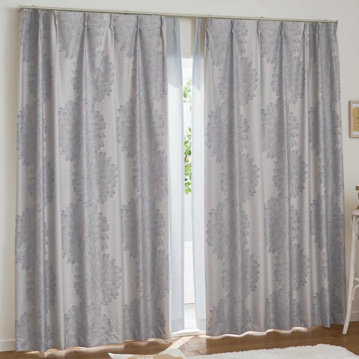 〔形状記憶加工付き〕大輪のダリアの花で、お部屋を洗練された印象に。裏面にアクリル樹脂コーティングを施し、デザイン性だけではなく機能性にも優れたカーテンです。マンションにもおすすめの遮音効果もプラスしました。