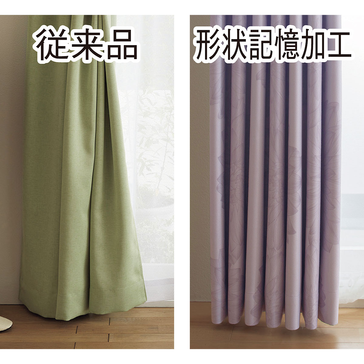 形状記憶加工付きで、届いたときからキレイなドレープが長続き。