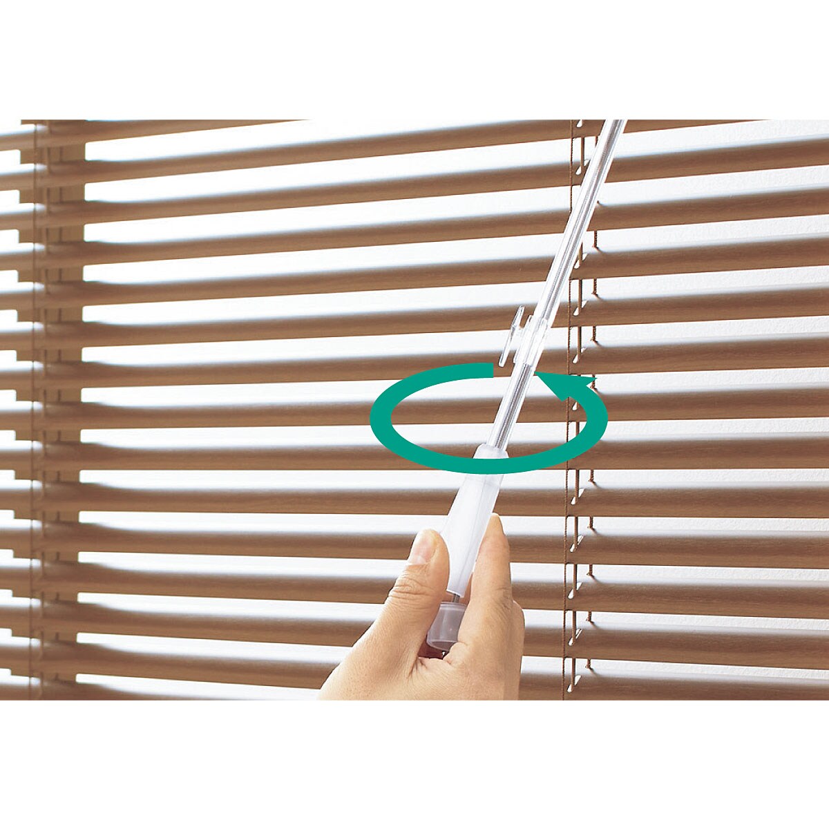 木肌独特の風合いや色合いを表現した、木目調アルミブラインドです。昇降はコードを引くだけの簡単操作。お好みの位置に調節もOK。女性の手でも握りやすく、回しやすい形状のポールで羽根の開閉もスムーズです。設置は仮止めフックに引っ掛けて位置調整が可能。付属の取り付け金具を使えば、お使いのカーテンレールにも設置できます。豊富なサイズ展開で、お部屋の掃き出し窓や腰窓・キッチン横の小窓までさまざまな場所を気軽に模様替え。家具などにもマッチして、お部屋の雰囲気をアップします。