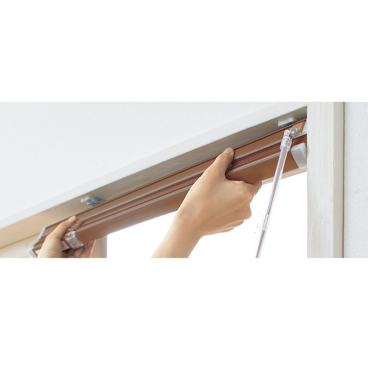 木肌独特の風合いや色合いを表現した、木目調アルミブラインドです。昇降はコードを引くだけの簡単操作。お好みの位置に調節もOK。女性の手でも握りやすく、回しやすい形状のポールで羽根の開閉もスムーズです。設置は仮止めフックに引っ掛けて位置調整が可能。付属の取り付け金具を使えば、お使いのカーテンレールにも設置できます。豊富なサイズ展開で、お部屋の掃き出し窓や腰窓・キッチン横の小窓までさまざまな場所を気軽に模様替え。家具などにもマッチして、お部屋の雰囲気をアップします。
