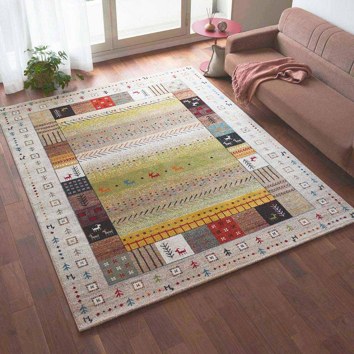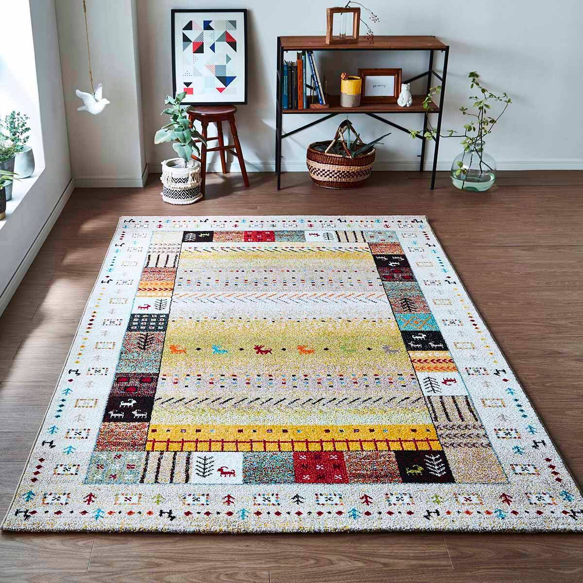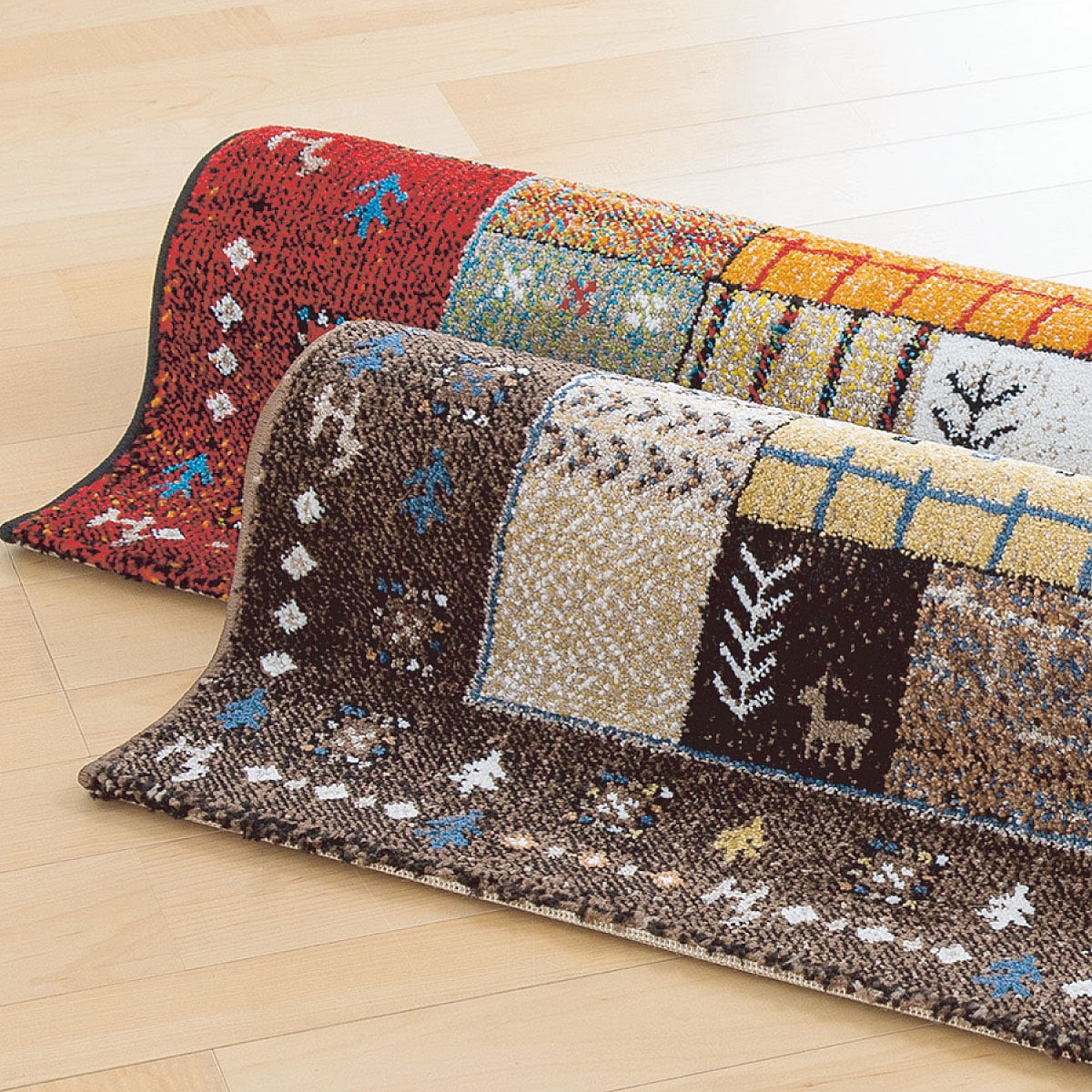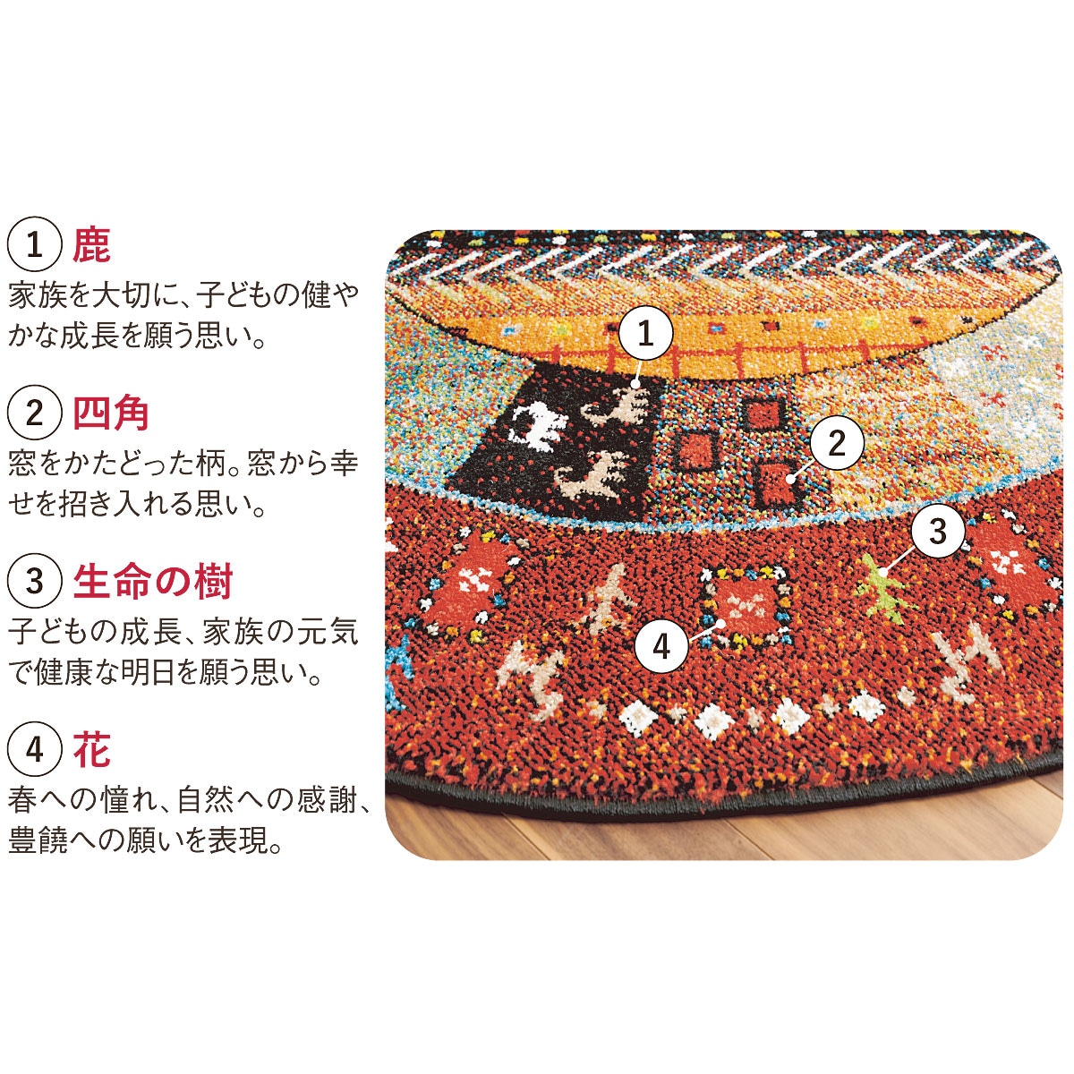 ふかふかとしたやわらかな踏み心地で摩耗に強い丈夫な素材を使用した、トルコ製のウィルトンラグです。18世紀イギリスで生まれた伝統あるウィルトン織りは、美しいだけでなく弾力性や耐久性にも優れていることから、数多くの高級ホテルでも使用されてきました。遊牧民に伝わる伝統の「ギャッベ」柄は、子供の成長や家族の健康、自然への感謝など様々な思いが込められています。色鮮やかに表現された模様がお部屋を上質な空間に。折りじわができにくい丸巻きでお届けします。