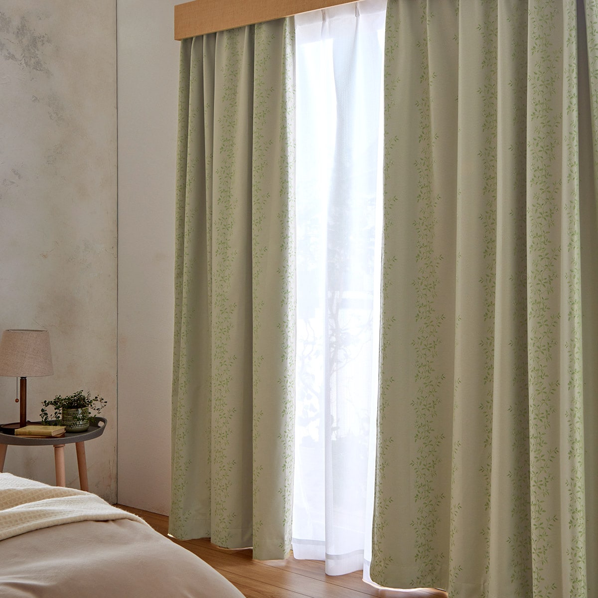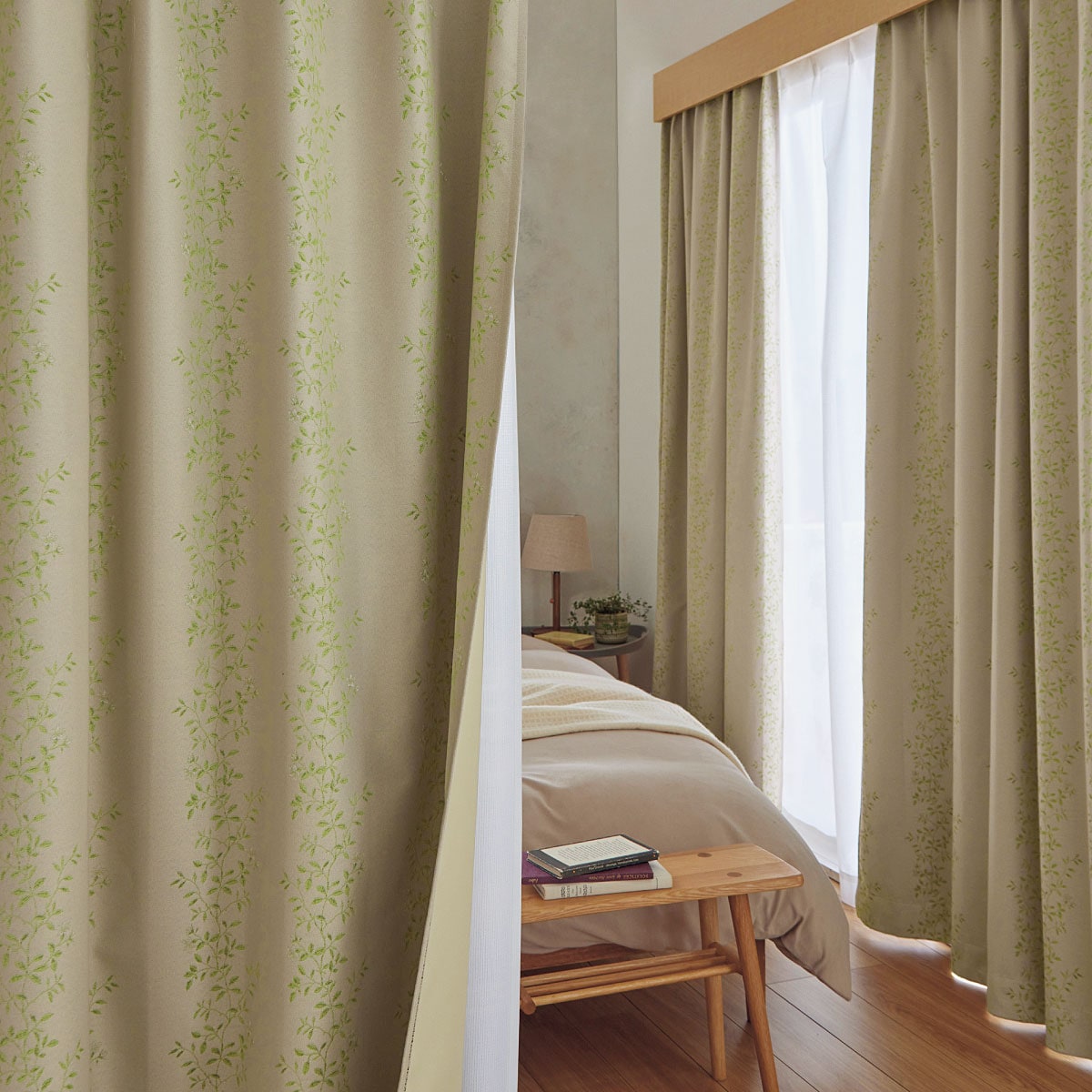 おうち時間を明るく華やいだ気分にしてくれる、ラインリーフ柄のジャカード織カーテンです。1級遮光・遮音・遮熱・保温効果でデザインだけではなく機能性にもこだわりました。省エネ対策にもおすすめです。
