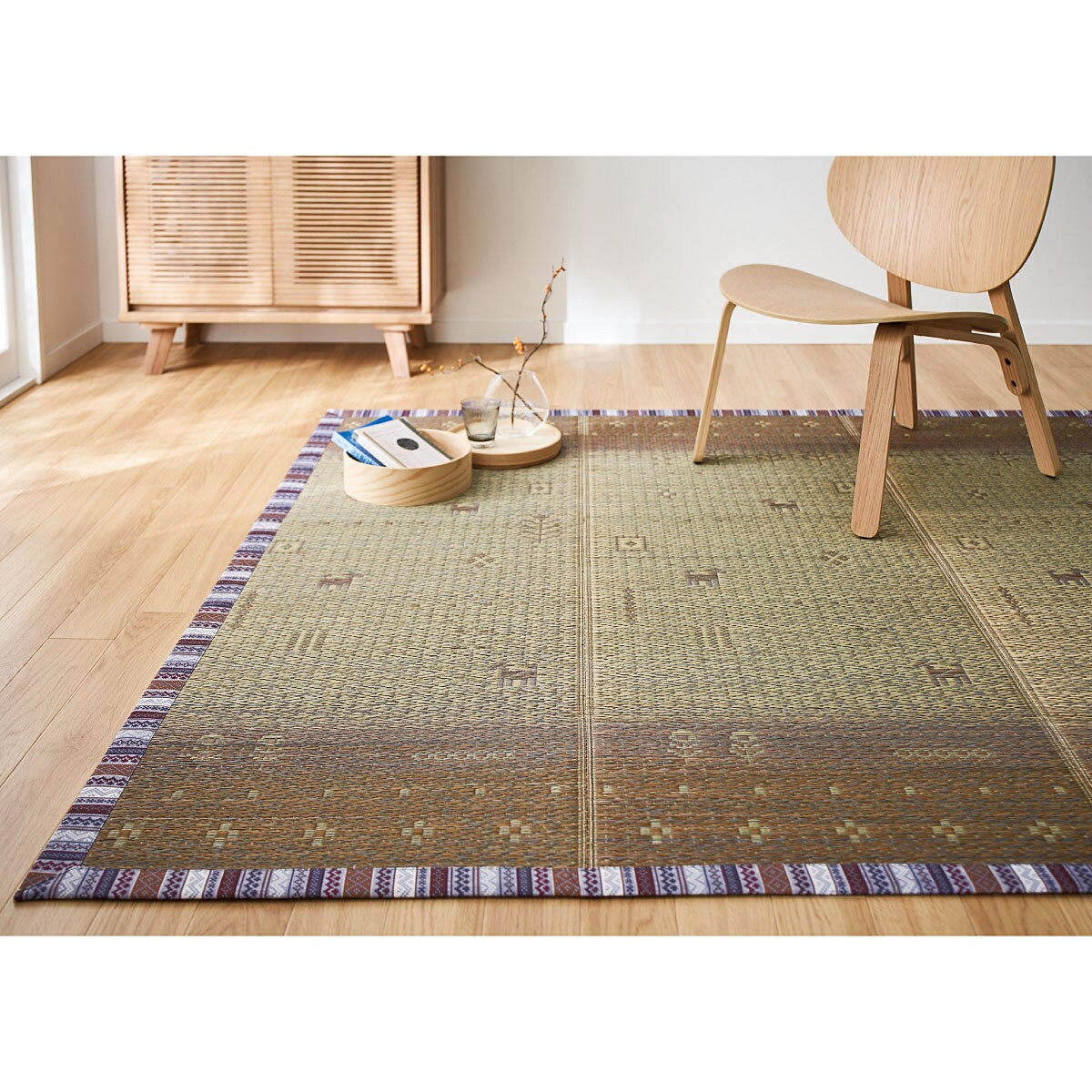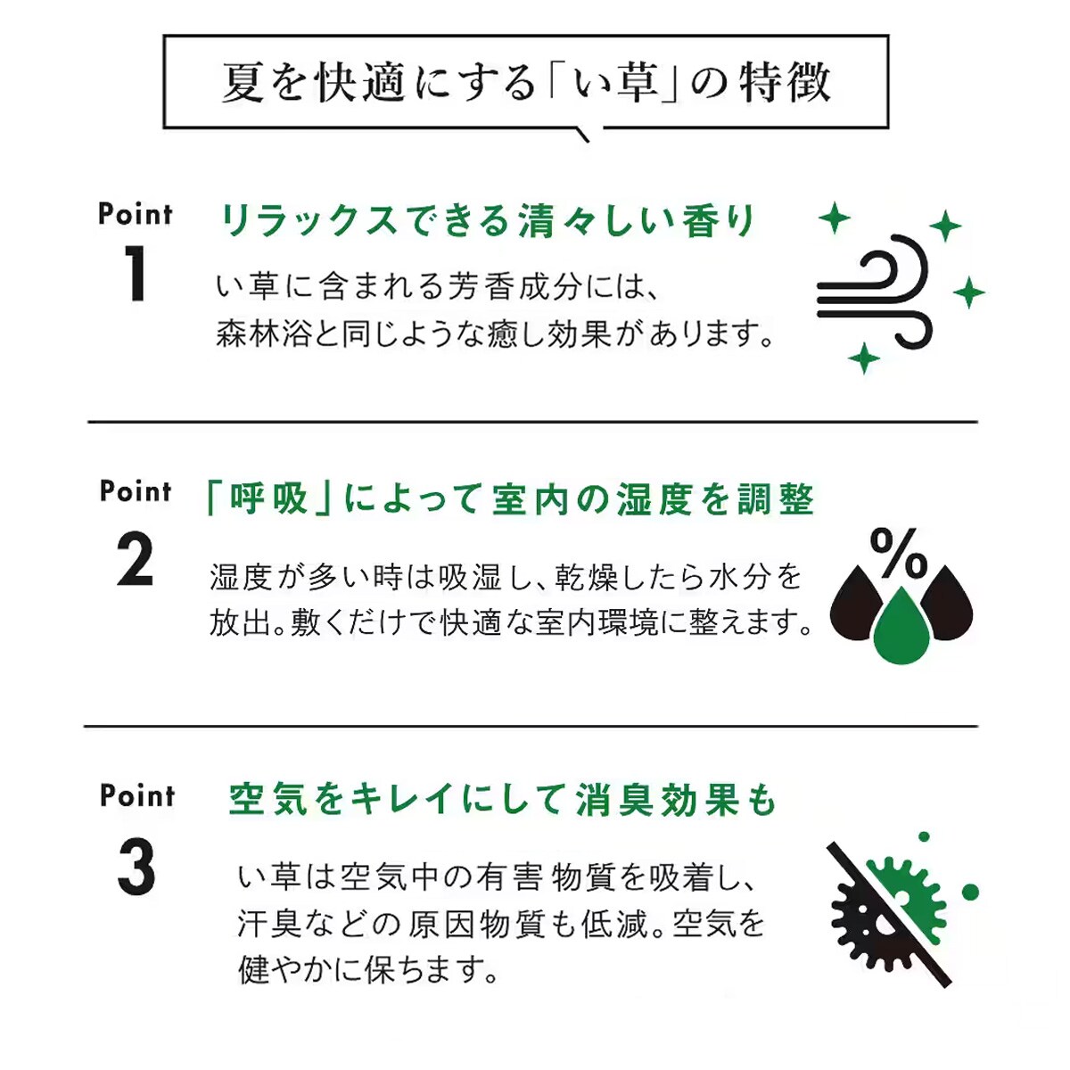 【快適に過ごせる「い草」の特徴】1.リラックスできる清々しい香りい草に含まれる芳香成分には、森林浴と同じような癒やし効果があります。2.「呼吸」によって室内の湿度を調整い草は内部に多くの気孔があり、夏は湿気を吸収して涼しく、冬は水分を放出してあたたかく保つ性質を備えています。3.空気をキレイにして消臭効果もい草は空気中の有害物質を吸着し、汗臭などの原因物質も低減。空気を健やかに保ちます。■[表地]い草 [裏地]不織布(ポリエステル) ■厚み/約4mm ▼商品・サイズによって柄の出方が多少異なります▼天然素材商品のため、商品色・サイズ・風合いが異なる場合があります●裏面にすべりにくい加工 ●折りたたんだ状態でお届けします●中国製 【抗菌防臭】(ヒバエッセンス加工)【小型別配送】※沖縄県や一部島しょ部など配送上の都合によりお届けできない地域がございます。