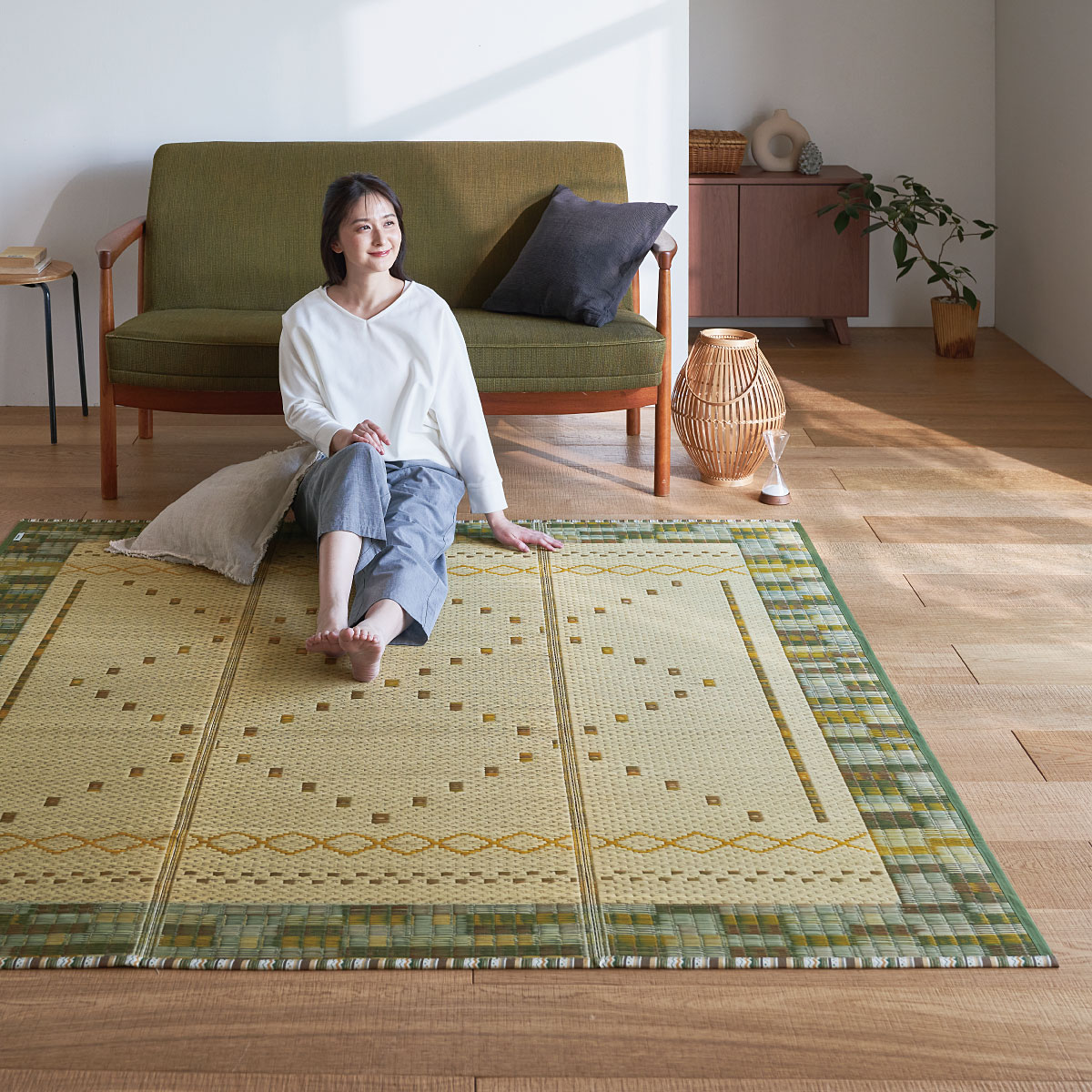 べたつかずさらっとした使い心地はそのままに、洋室に似合う模様を織り込んだい草ラグです。い草は「和」のイメージが強く、洋室に取り入れるのは難しく感じられますが、そのナチュラルな風合いで木調の家具やグリーンのあるインテリアと驚くほどよくなじみ、素朴な色や柄使いがリビングに楽しいリズムをもたらします。表面は高密度な織り込みでゴミやホコリが詰まりにくく、お手入れもラクラク。裏面はすべりにくい加工を施しました。年々厳しくなる気温や湿度の変化に、もう一度い草のある生活を。