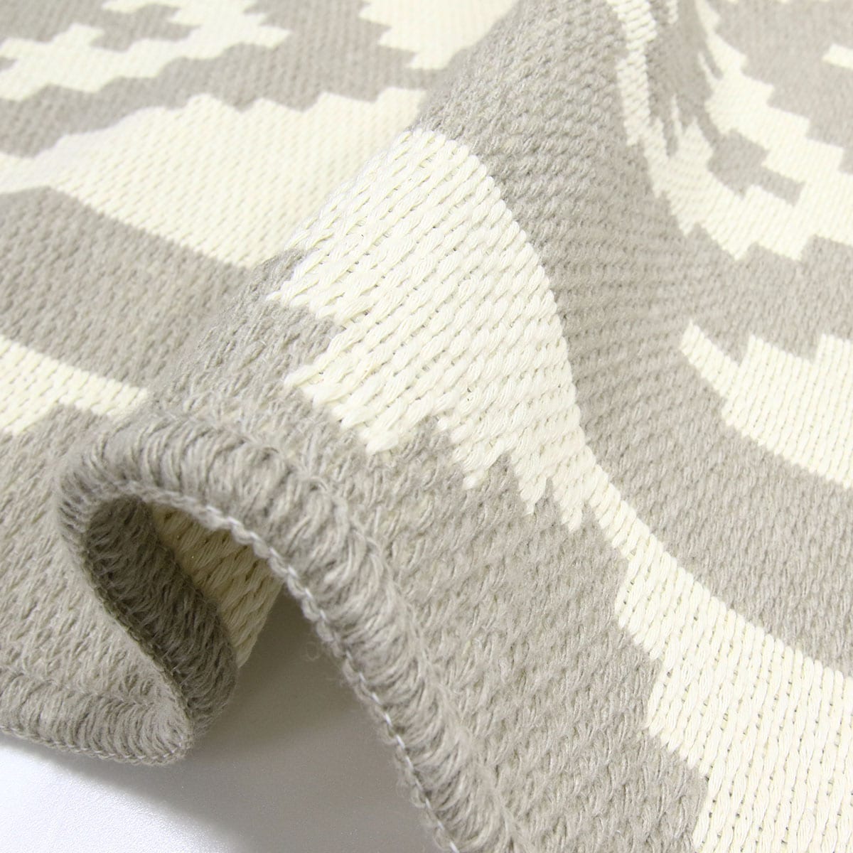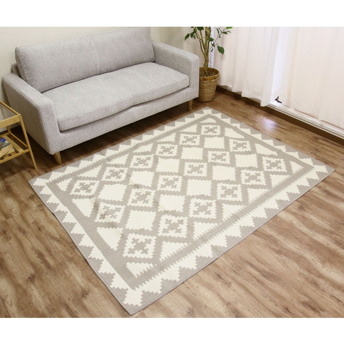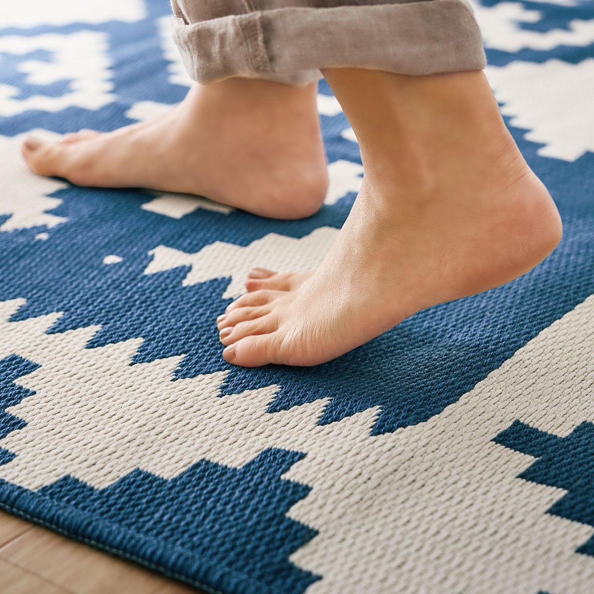 足離れがよく、爽やかなデザインの綿混平織りラグです。 爽やかな踏み心地でベタつきにくく、汗ばむ季節でも快適に過ごせます。