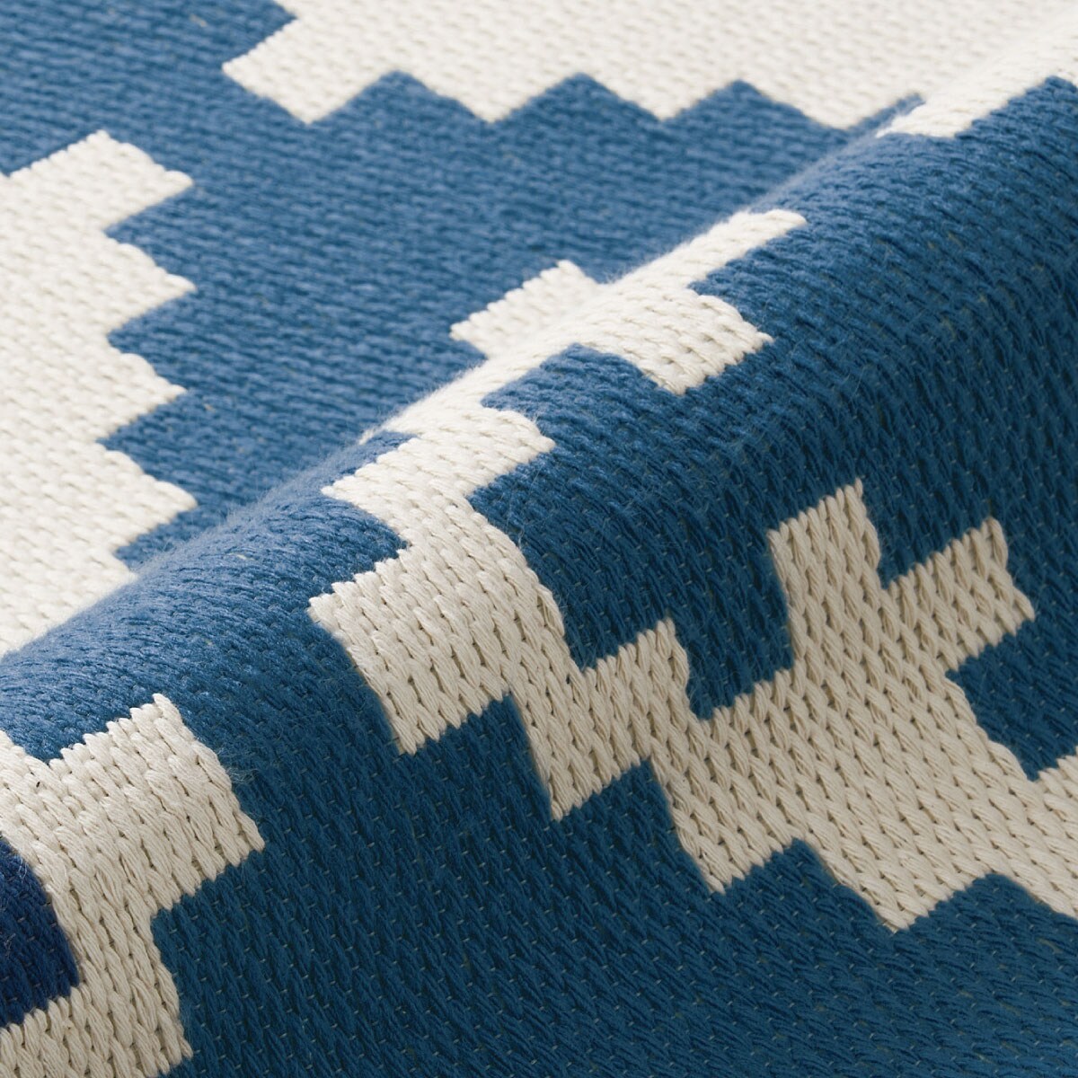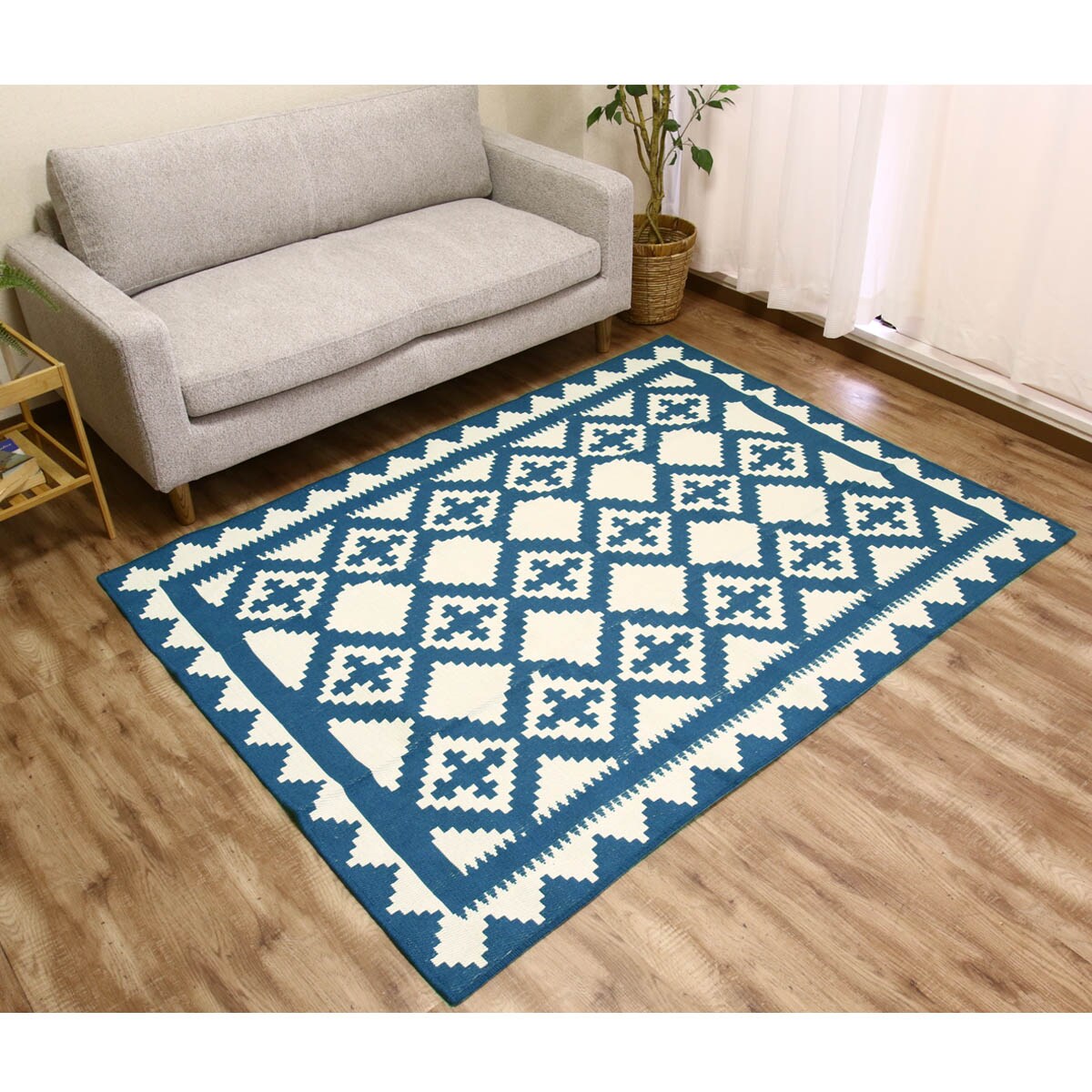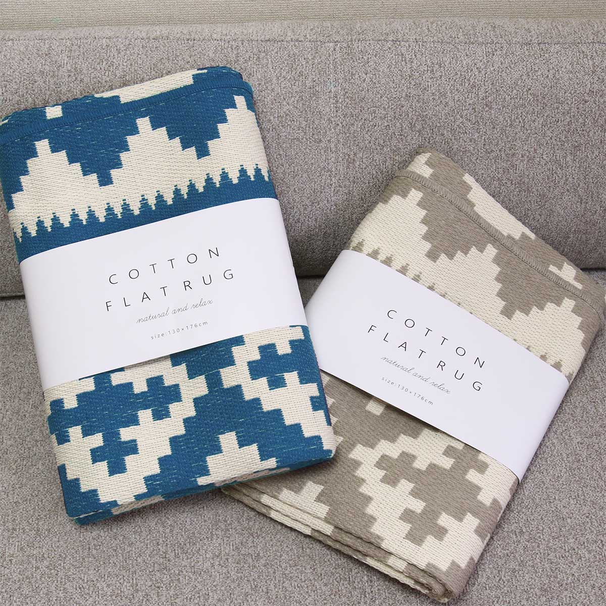 足離れがよく、爽やかなデザインの綿混平織りラグです。 爽やかな踏み心地でベタつきにくく、汗ばむ季節でも快適に過ごせます。