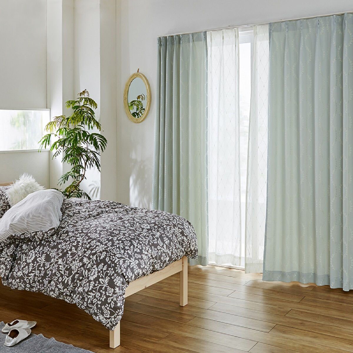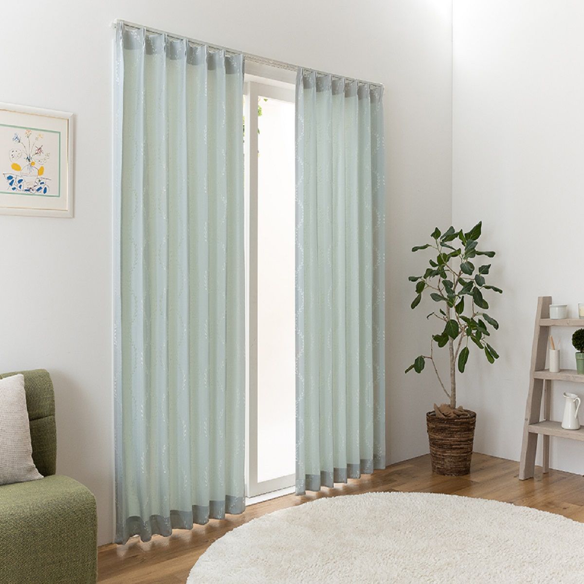波のように並べた繊細なリーフ柄を織りで表現したデザインが美しい、高級感のあるジャカードカーテンです。爽やかな印象のミスティブルーはフェミニンにもクールにも合わせやすく、左右対称の柄が落ち着いた雰囲気を演出します。風合いのある生地を通して、ナチュラルな明るい光が入る非遮光タイプ。お部屋をあまり暗くしたくないリビングなどにもおすすめです。形状記憶加工付きで裾が広がりにくく、きれいなドレープを保ちます。ご家庭の洗濯機で気軽に洗えます。