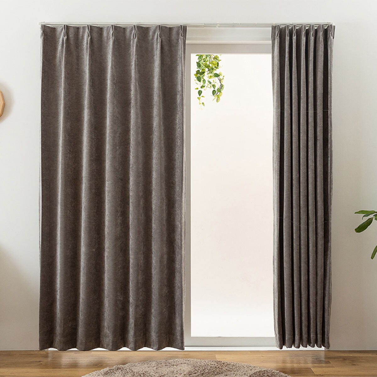グレージュベルベットのようにラグジュアリーなモール糸を使用した遮光カーテンです。