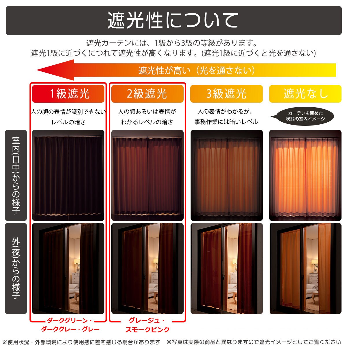 【遮光性について】1級から3級の等級があります。遮光1級に近づくにつれて遮光性が高くなります(遮光1級に近づくと光を通さない)。※使用状況・外部環境により使用感に差を感じる場合があります。写真は実際の商品と異なりますので遮光イメージとしてご覧ください。