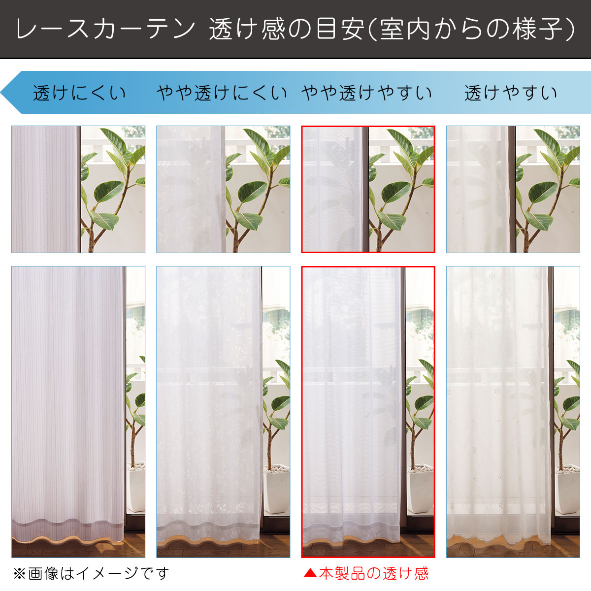 【透け感について】レースカーテンの透け感の目安(室内からの様子)UVカット率・遮熱保温効果・目隠し効果の高いレースカーテンは、一般的なレースカーテンに比べて、内から外が見えにくくなります。昼間はお部屋の中が若干暗く感じる場合があります。※商品の素材感や色味・使用環境により異なりますのであくまで目安としてください。