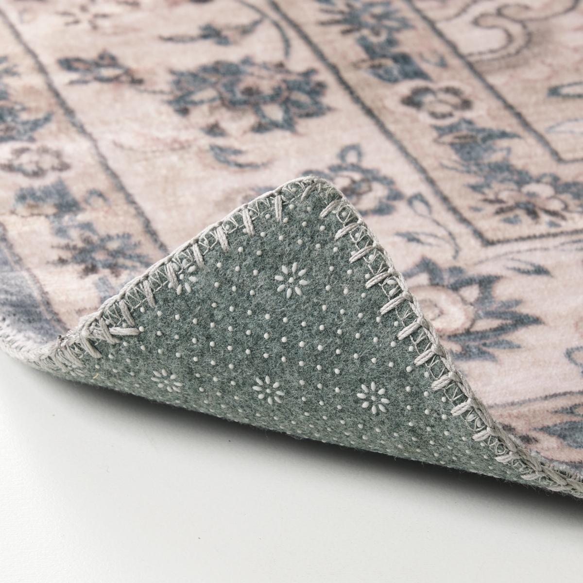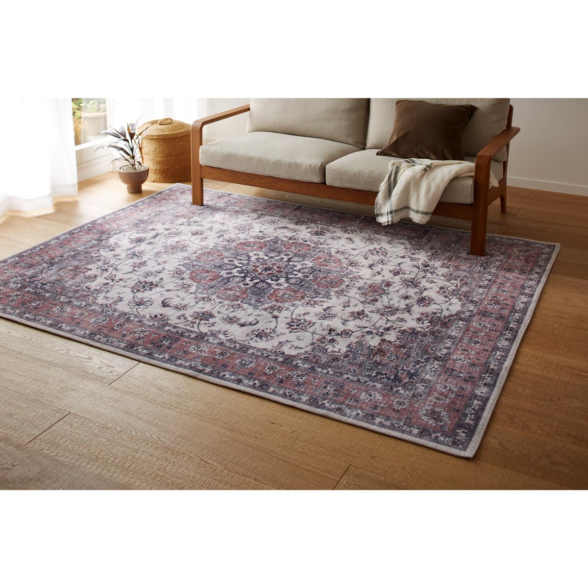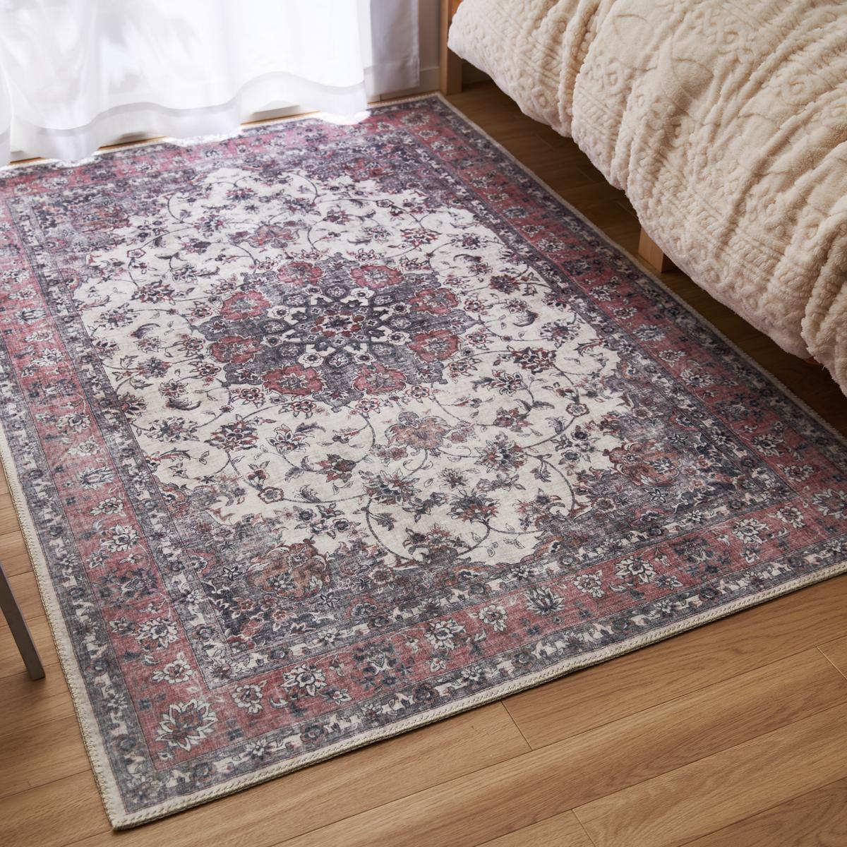 ヴィンテージ絨毯風のインテリアラグです。使い込まれたようなかすれ感が魅力の「メダリオン柄」をプリントで繊細に表現。端は手織り風のこだわりある仕上げで、高級感が感じられます。裏面はすべり止めつきでズレにくく、短毛なのでお手入れも簡単です。