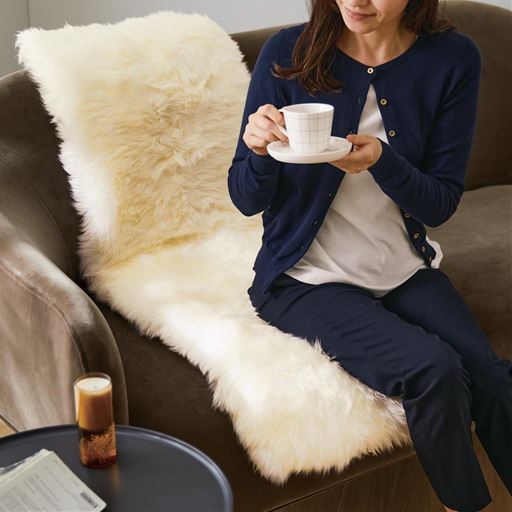 天然素材であるムートンは、あたたかいうえに水や汚れに強く、クッション性にも優れています。一度使うと、手放せないほどの心地よさです。湿気を吸って放出するからムレにくく、いつもさらっと快適な肌ざわり。最長約4cmと毛足が長く、ふかふかと埋もれるような手ざわり。イスの背もたれから縦に掛ければ、背中や腰まであたたかく、リッチな気分に。裏面はやわらかな素材で、床やイスを傷付けにくくなっています。