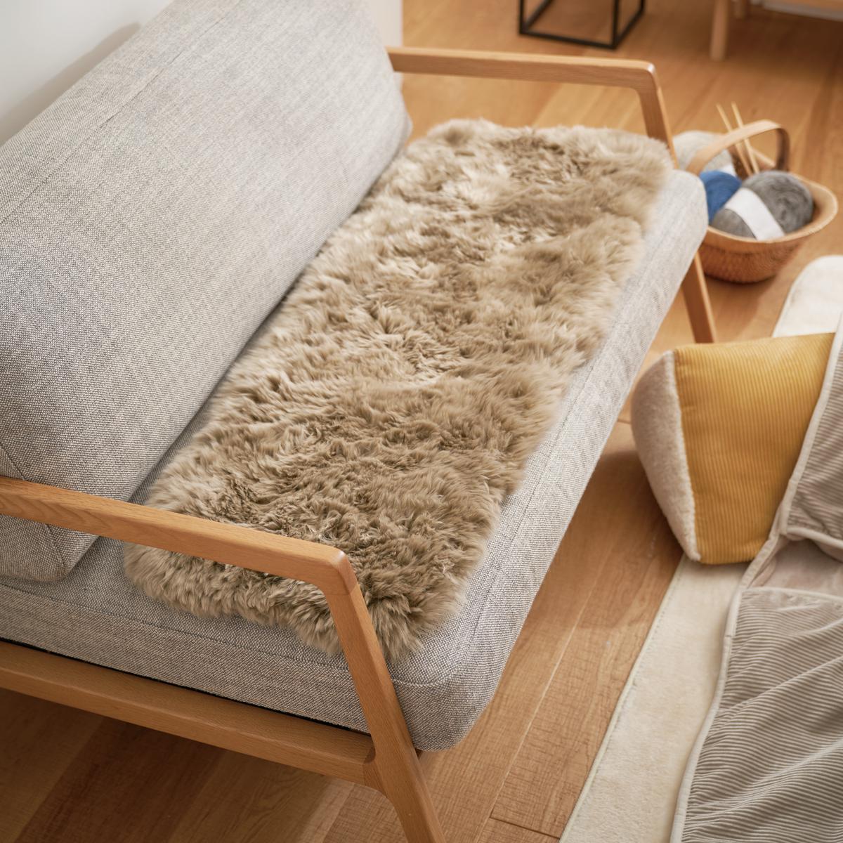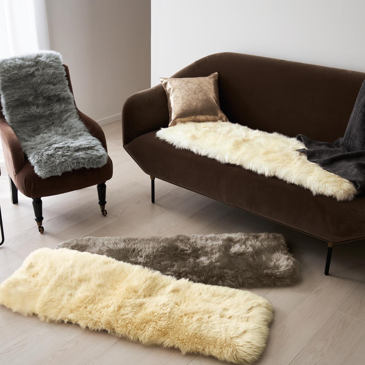 天然素材であるムートンは、あたたかいうえに水や汚れに強く、クッション性にも優れています。一度使うと、手放せないほどの心地よさです。湿気を吸って放出するからムレにくく、いつもさらっと快適な肌ざわり。最長約4cmと毛足が長く、ふかふかと埋もれるような手ざわり。イスの背もたれから縦に掛ければ、背中や腰まであたたかく、リッチな気分に。裏面はやわらかな素材で、床やイスを傷付けにくくなっています。
