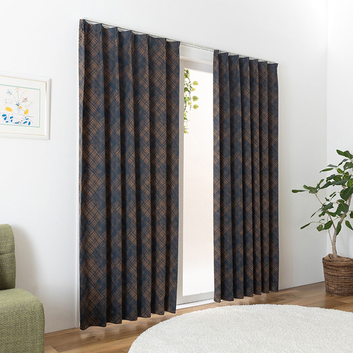 ネイビーランダムに交差するおしゃれなラインが魅力の2級遮光カーテンです。