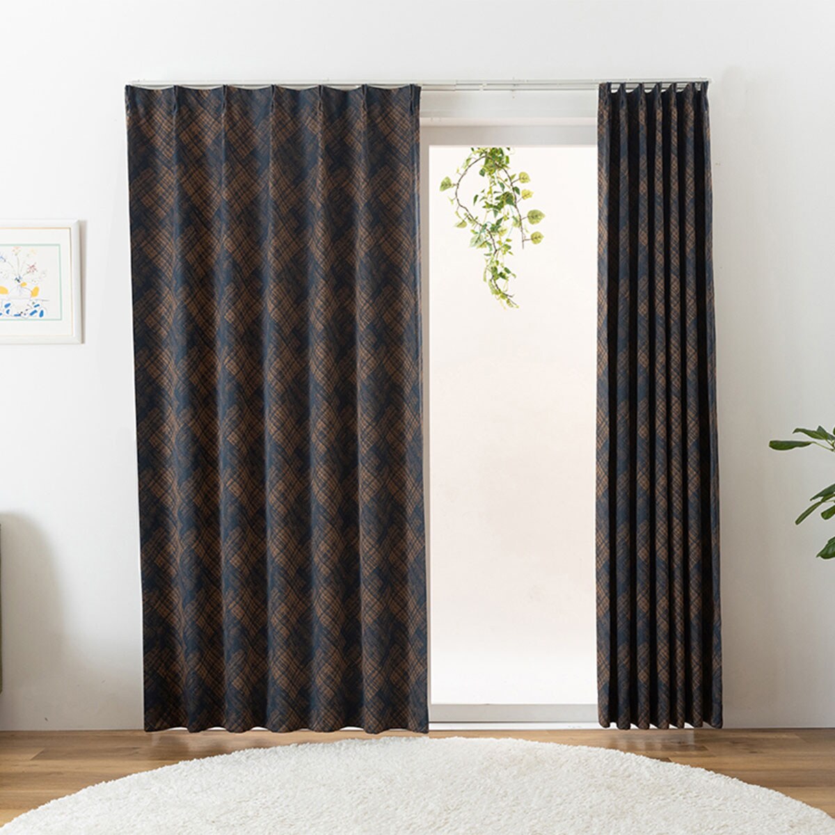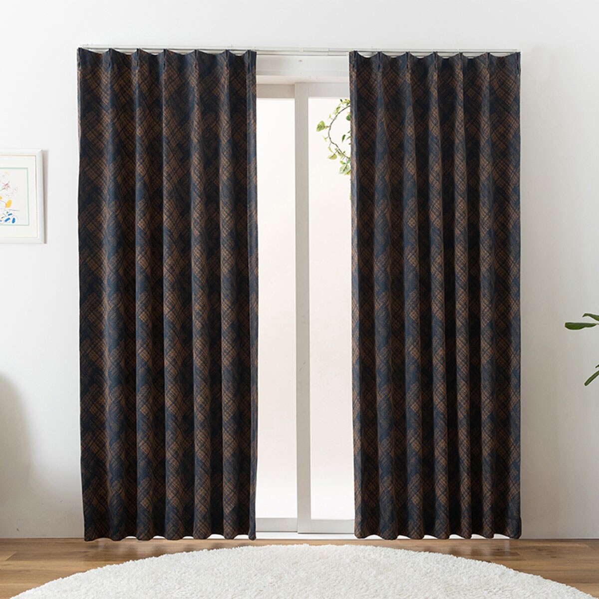 ネイビーランダムに交差するおしゃれなラインが魅力の2級遮光カーテンです。