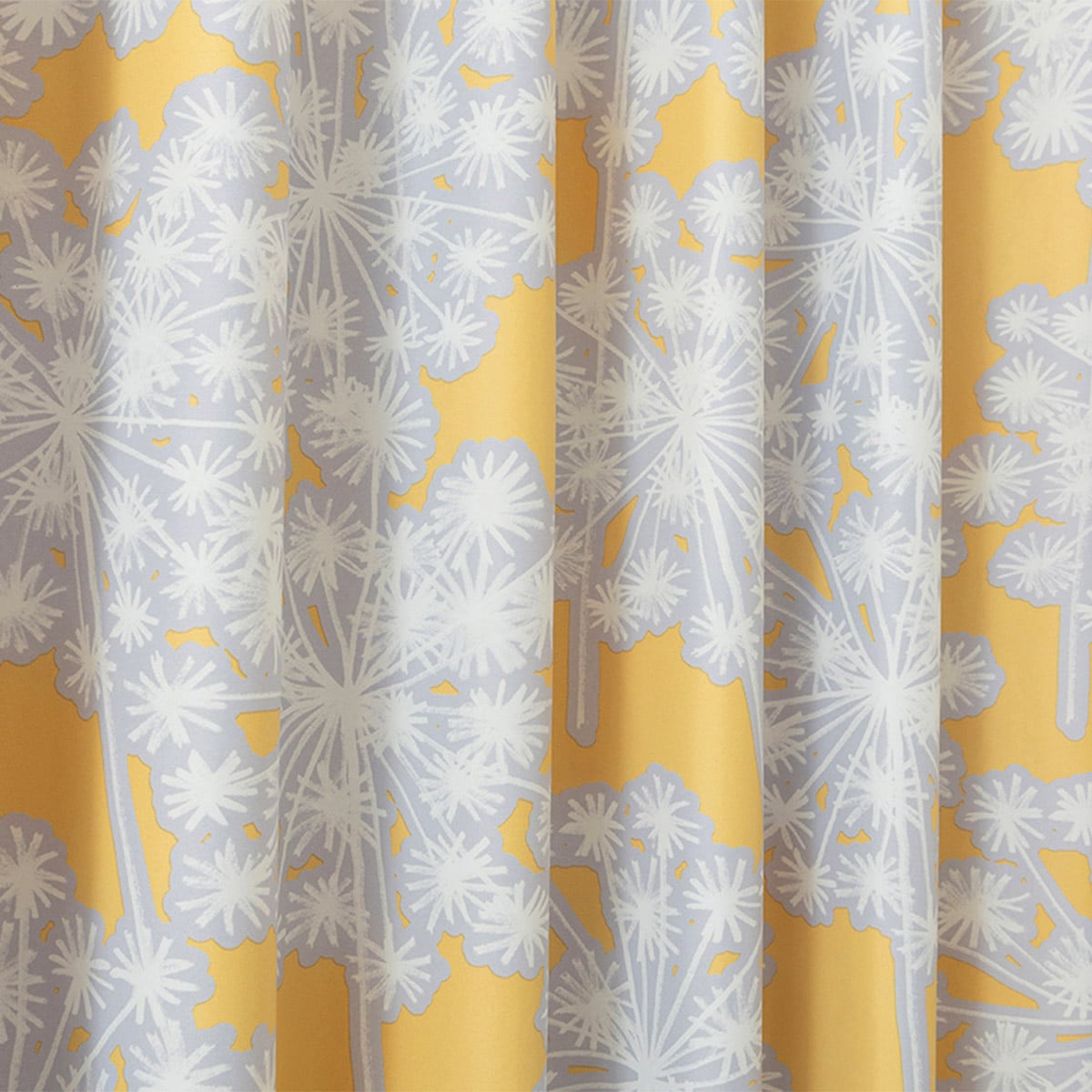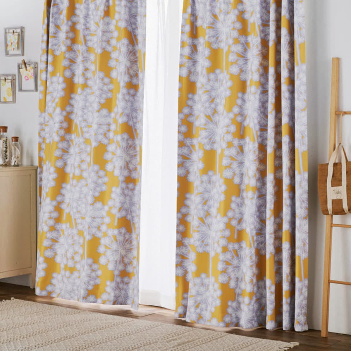 イエロー大きな花柄プリントが魅力的なカーテンです。