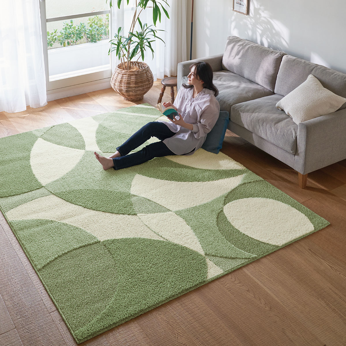 グリーン(横240×縦190cm)季節を問わずオールシーズン使える国産インテリアラグです。