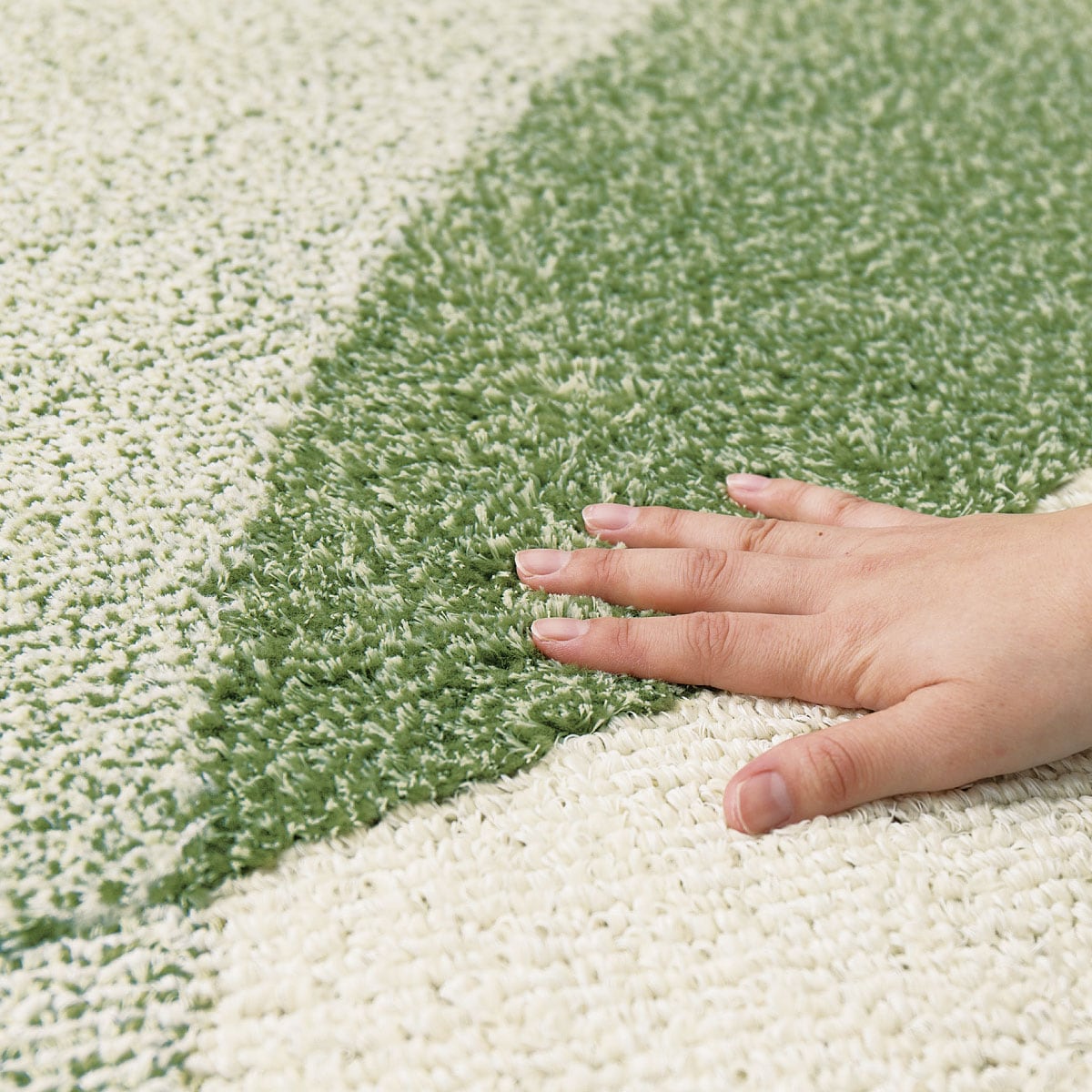 グリーンパイル地の変化と美しいグラデーションで模様が際立ちます。