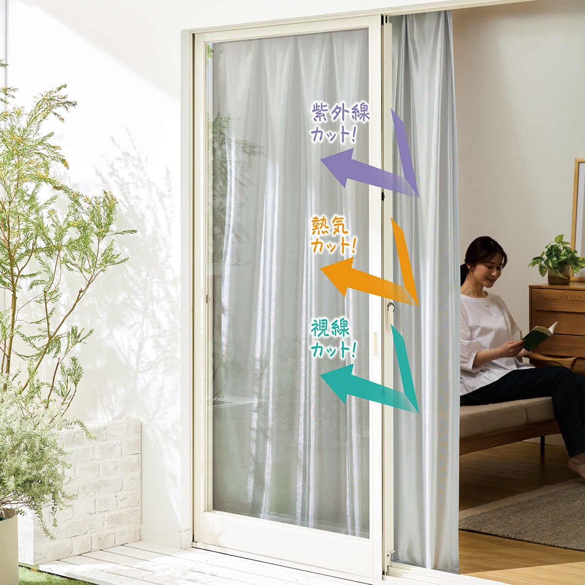 熱気はもちろん、紫外線や外からの視線や遮りプライバシーを守るミラーレースカーテンです。裏面のキラキラ光るアルミ効果で、窓から入る「熱気」「紫外線」「視線」をしっかりカット!