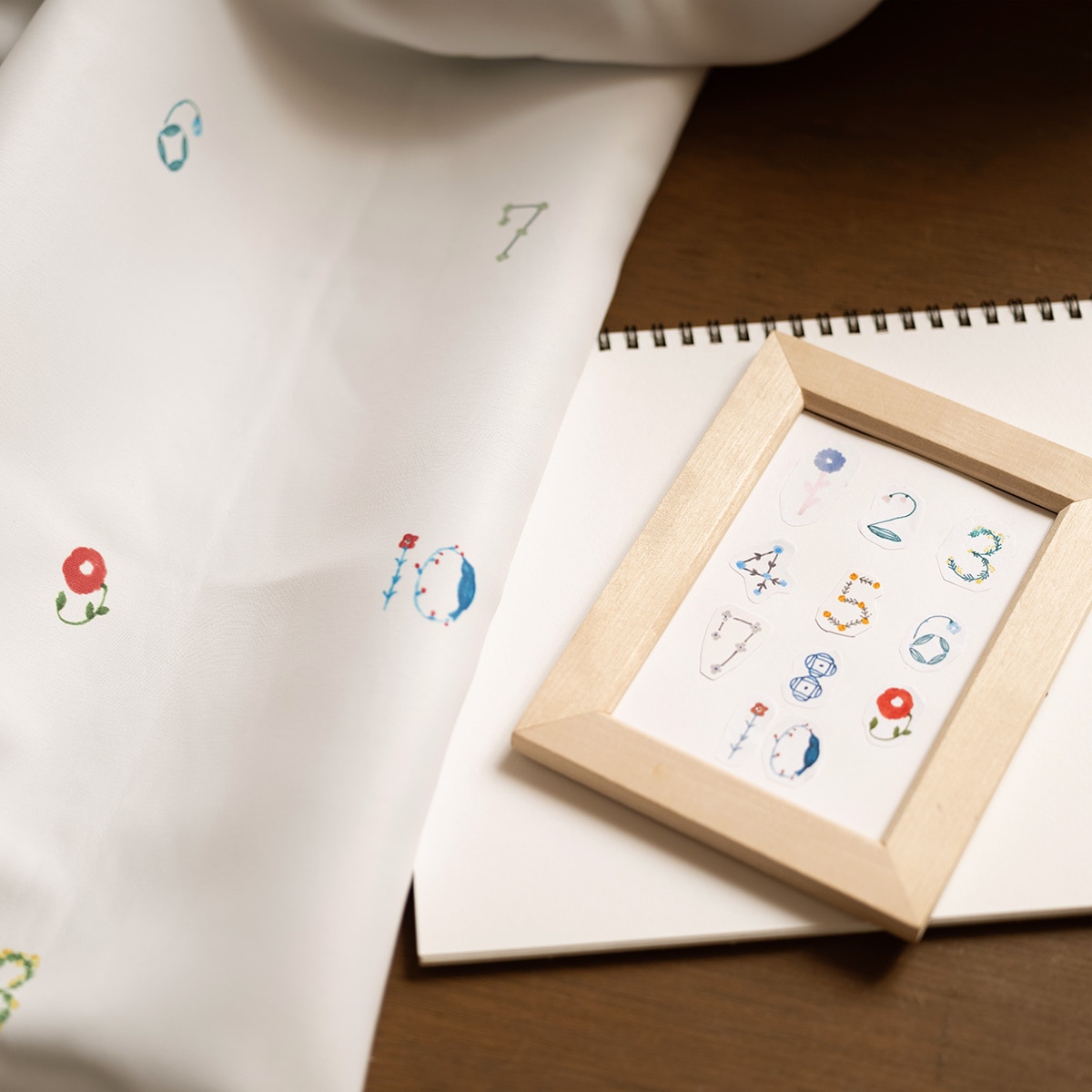 ホワイト系(花数字)草花で描いた1から10の数字の中に、青い鳥が一羽まぎれています。