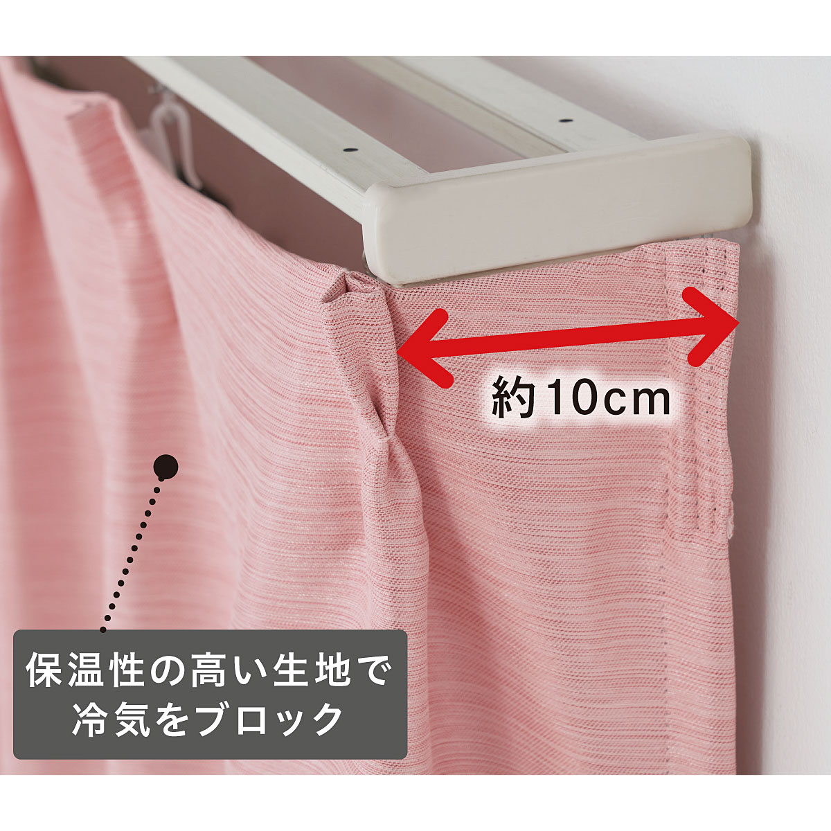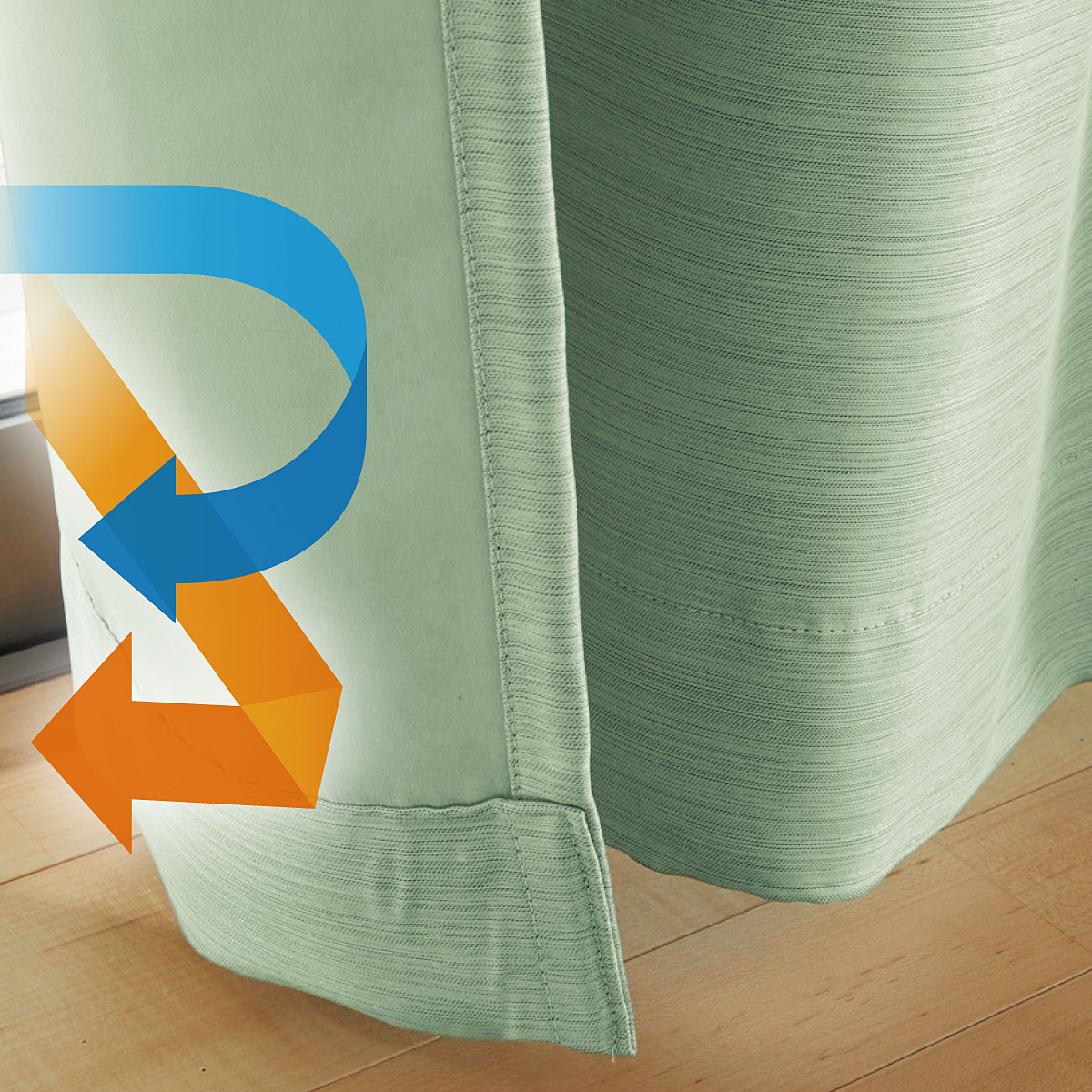 通常よりも幅を10cm長くしたリターン縫製。カーテンレールのサイドに回り込んですき間をブロックするので、光もれも防ぎ遮光性もアップ! 夏は冷房の涼しい空気を逃がさず1年中快適に。