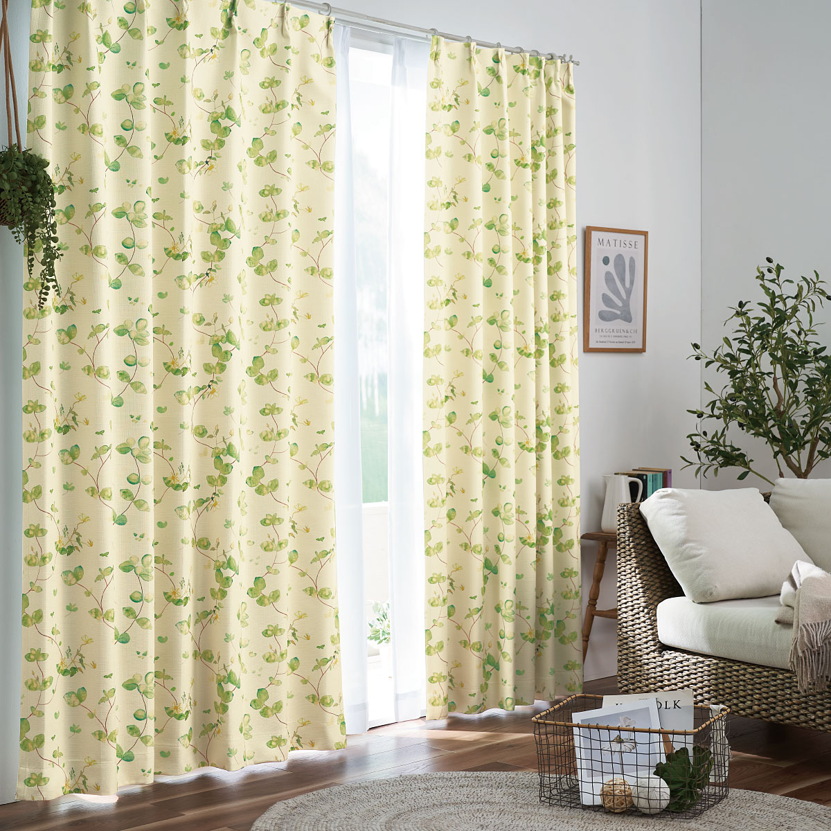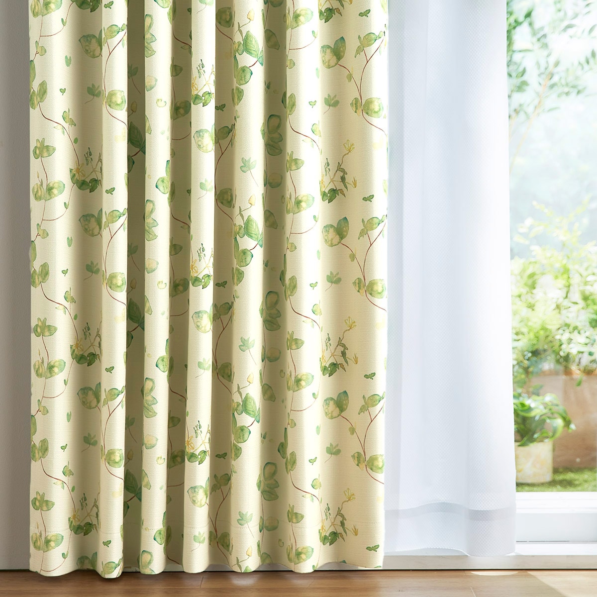グリーン系ナチュラル感あふれる水彩リーフ柄が美しい、1級遮光カーテンです。