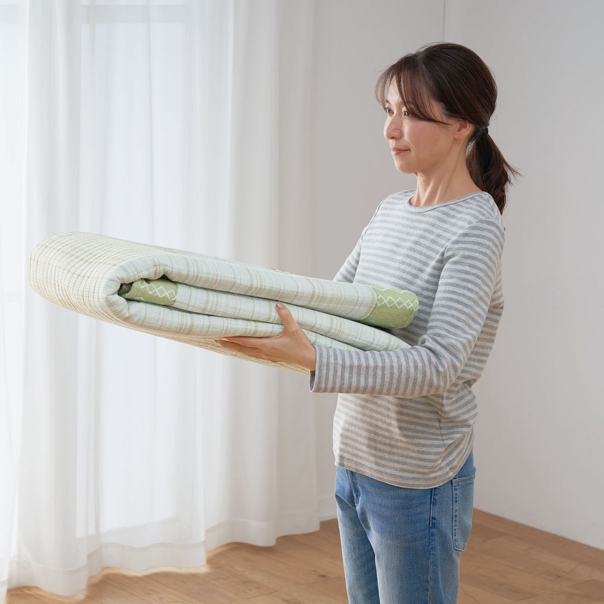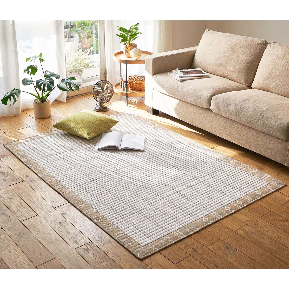 凹凸感のある肌ざわりが素足にも気持ちいい、綿100%のキルトラグです。シャリッと爽快なしじら織りで、快適な暮らしに♪軽くてコンパクトにたためるので、洗濯も収納もラクラクです。床暖房・ホットカーペットに対応しているのも嬉しいポイントです。