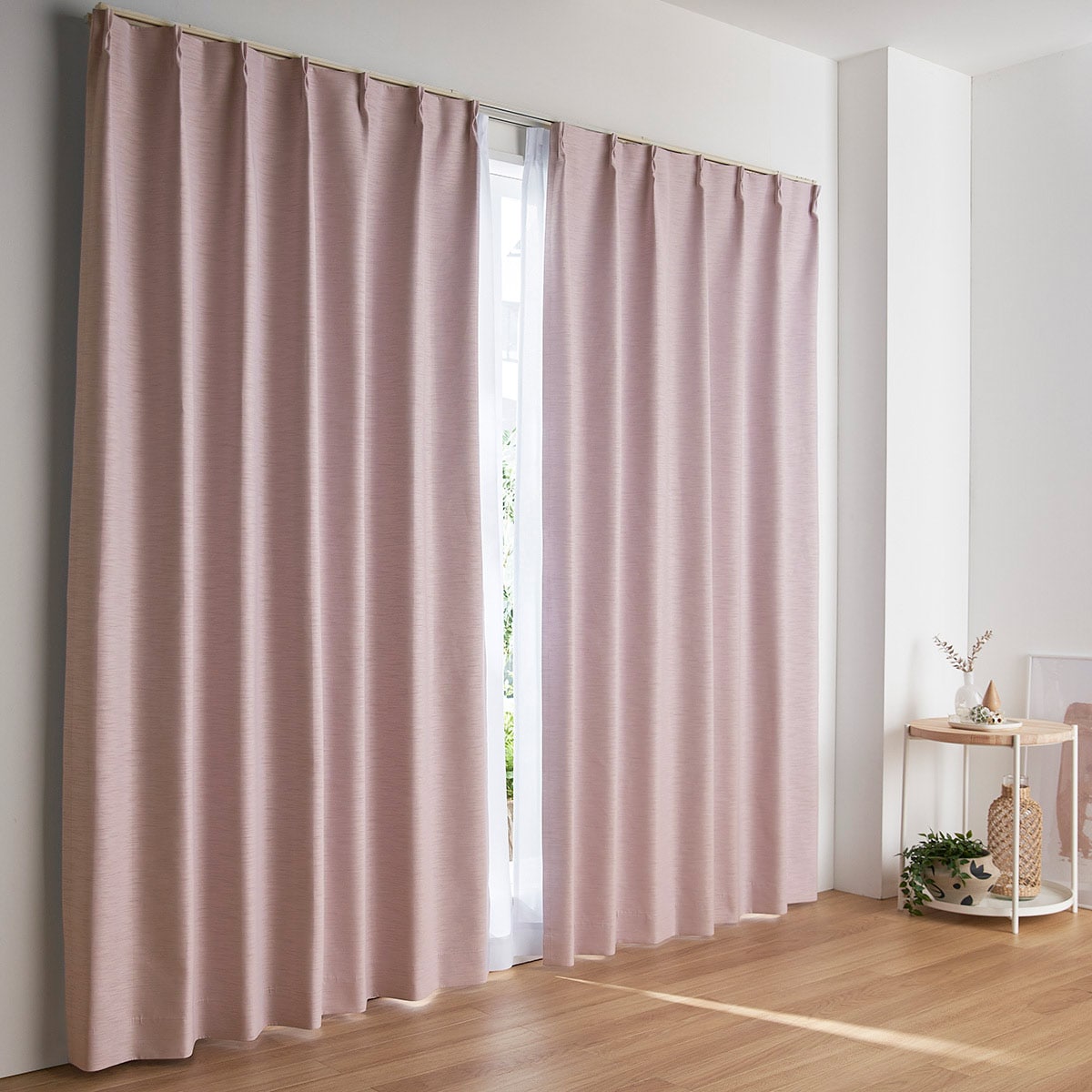 ローズピンクほどよい光沢と織り柄が美しい1級遮光カーテンです。表生地と裏生地の間に白・黒のフィルムを挟み込む事で約100%しっかりと遮光効果を発揮させます。