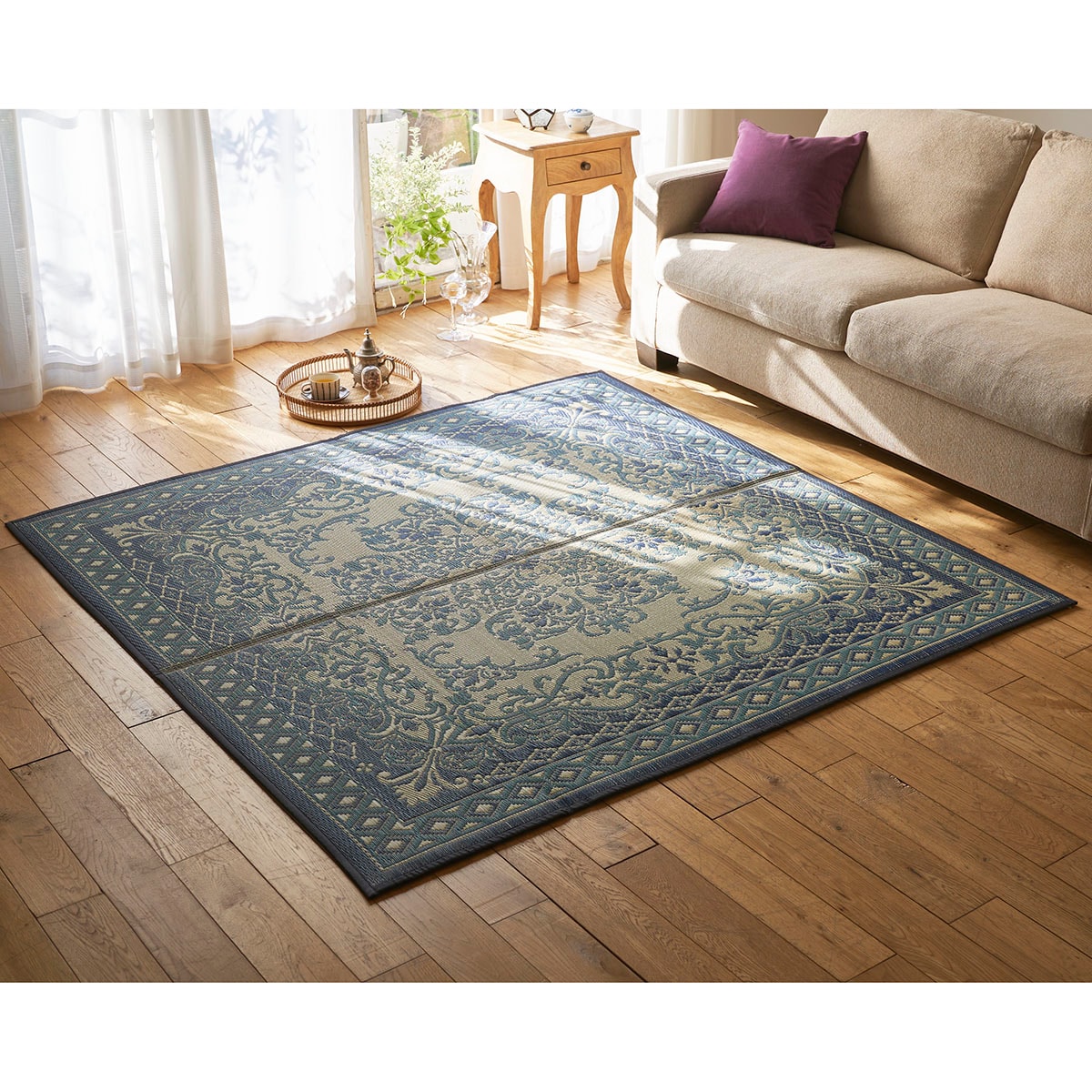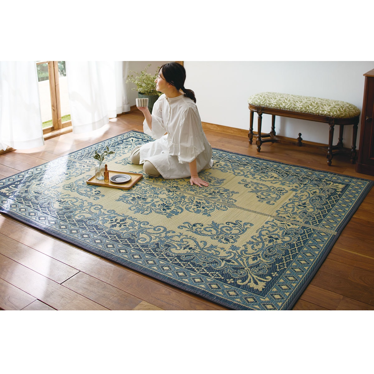 ブルー系洋室にも取り入れやすい、絨毯風のデザインが魅力のい草ラグです。