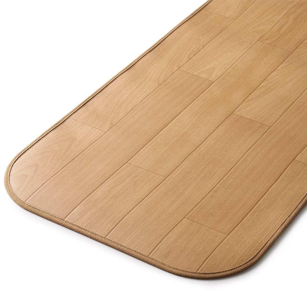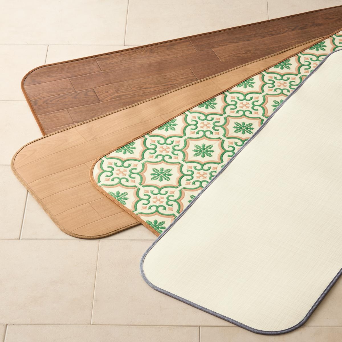 敷きたい場所に合うサイズがなかなか見つからない…という方におすすめの豊富な94サイズ! ぴったりがきっと見つかる、抗菌・防カビ機能を備えたキッチンマットです。水ハネや油汚れも染み込まないからお手入れ簡単。サッと拭くだけで、床面をいつも清潔に保てます。厚さ約4mmでキッチンの引き出しの開閉にも引っ掛かりません。ペットのお食事マットやワークスペースにもおすすめ。暮らしに馴染むナチュラルな木目調と無地調、アクセントになるタイル柄をご用意しました。折りじわのできない巻いた状態でお届けします。