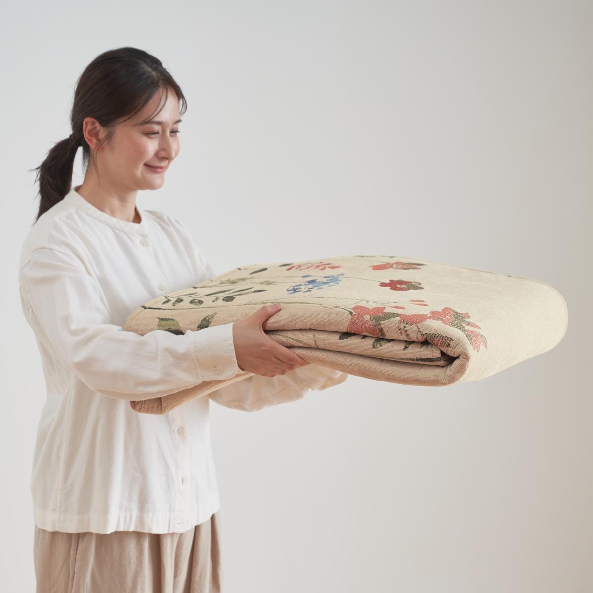 シェニール糸を織り込んだジャカード織りで、やさしい色合いの花柄を表現。サラリとした肌ざわりで、1年を通じて心地よくご使用いただけます。毛足がないのでホコリなどが絡まりにくくお掃除もラクラク。軽くて扱いやすく、コンパクトにたためて収納しやすいのも魅力です。