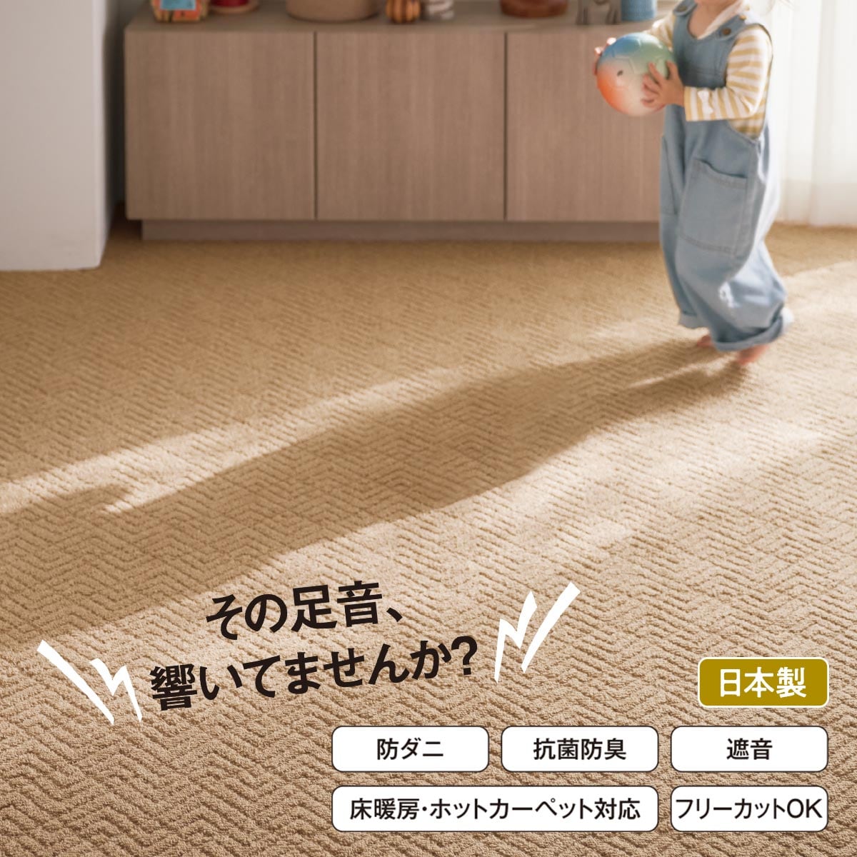 気になる生活音を軽減するには、カーペットがおすすめ!防ダニ・抗菌防臭機能をそろえて清潔仕様に。ふっくらした弾力のある踏み心地も魅力です。